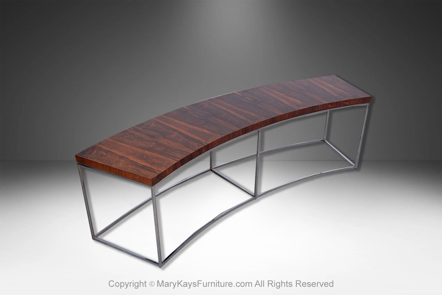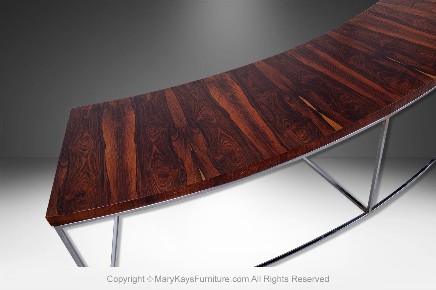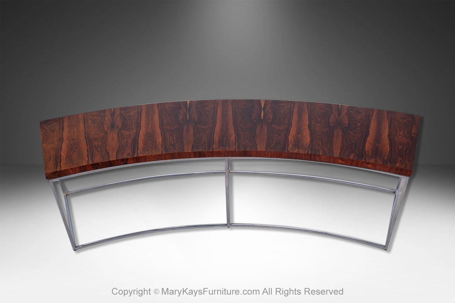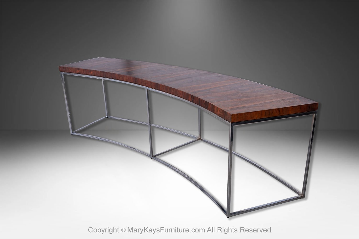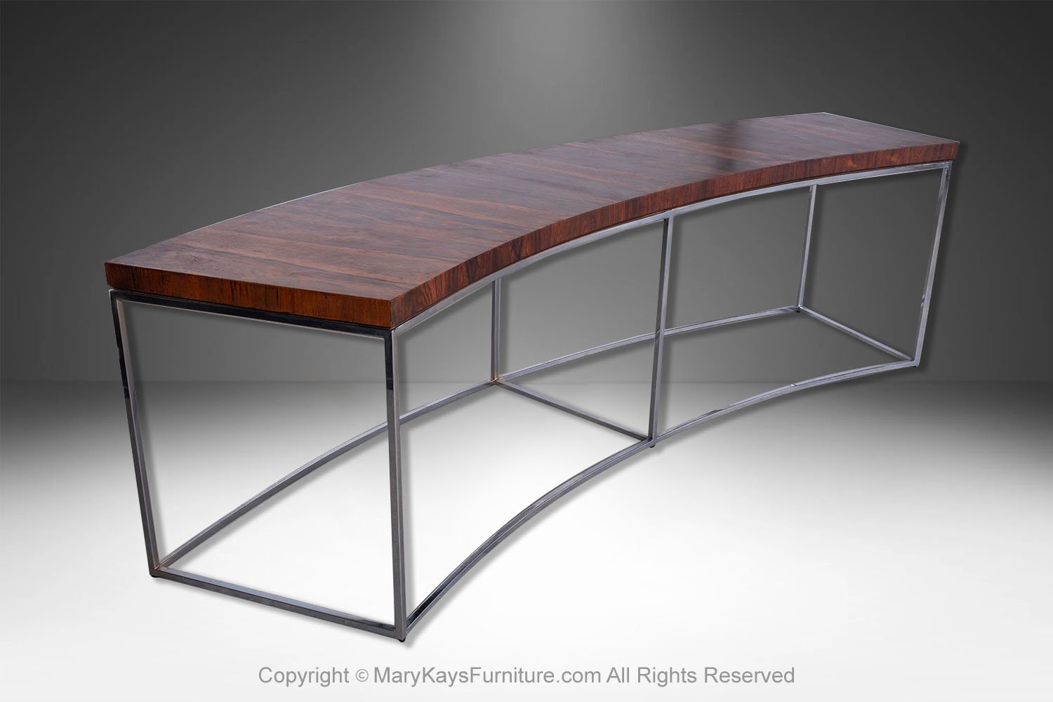 A handsome, sleek Modern curved console, sofa table / bench designed in the 1970’s by Milo Baughman made by Thayer Coggin. An exceptional table both for its form and quality. Featuring a beautifully curved tabletop in rosewood veneer, resting on a polished square chrome steel frame, creating an elegantly sleek profile. Versatile and minimalistic in design, this console sofa table will blend with any style of décor; as a welcoming addition to an entryway or placed behind a sofa. It can also be used behind our Milo Baughman curved sofa sold separately.