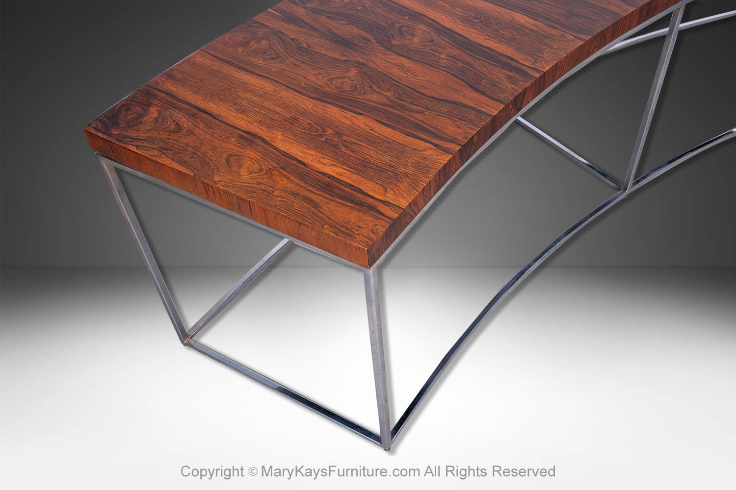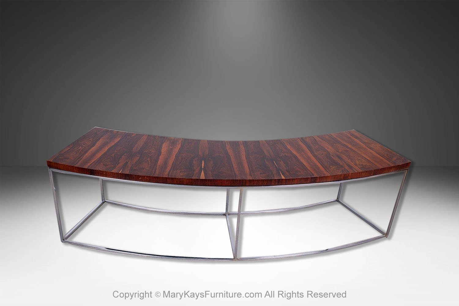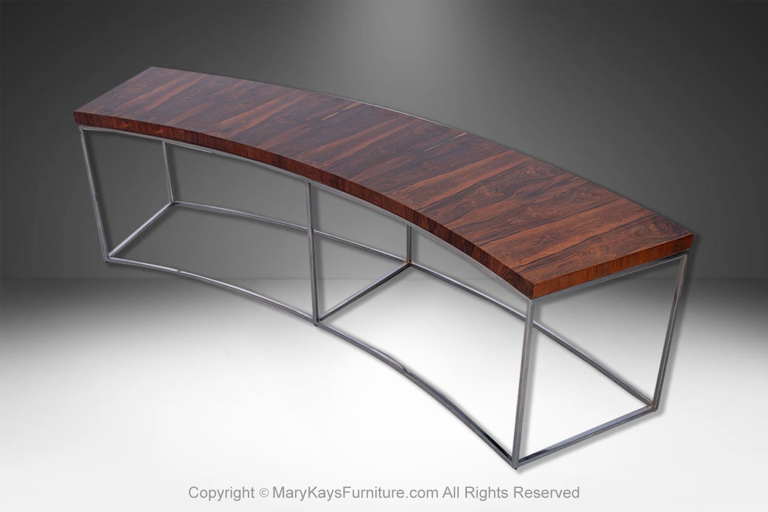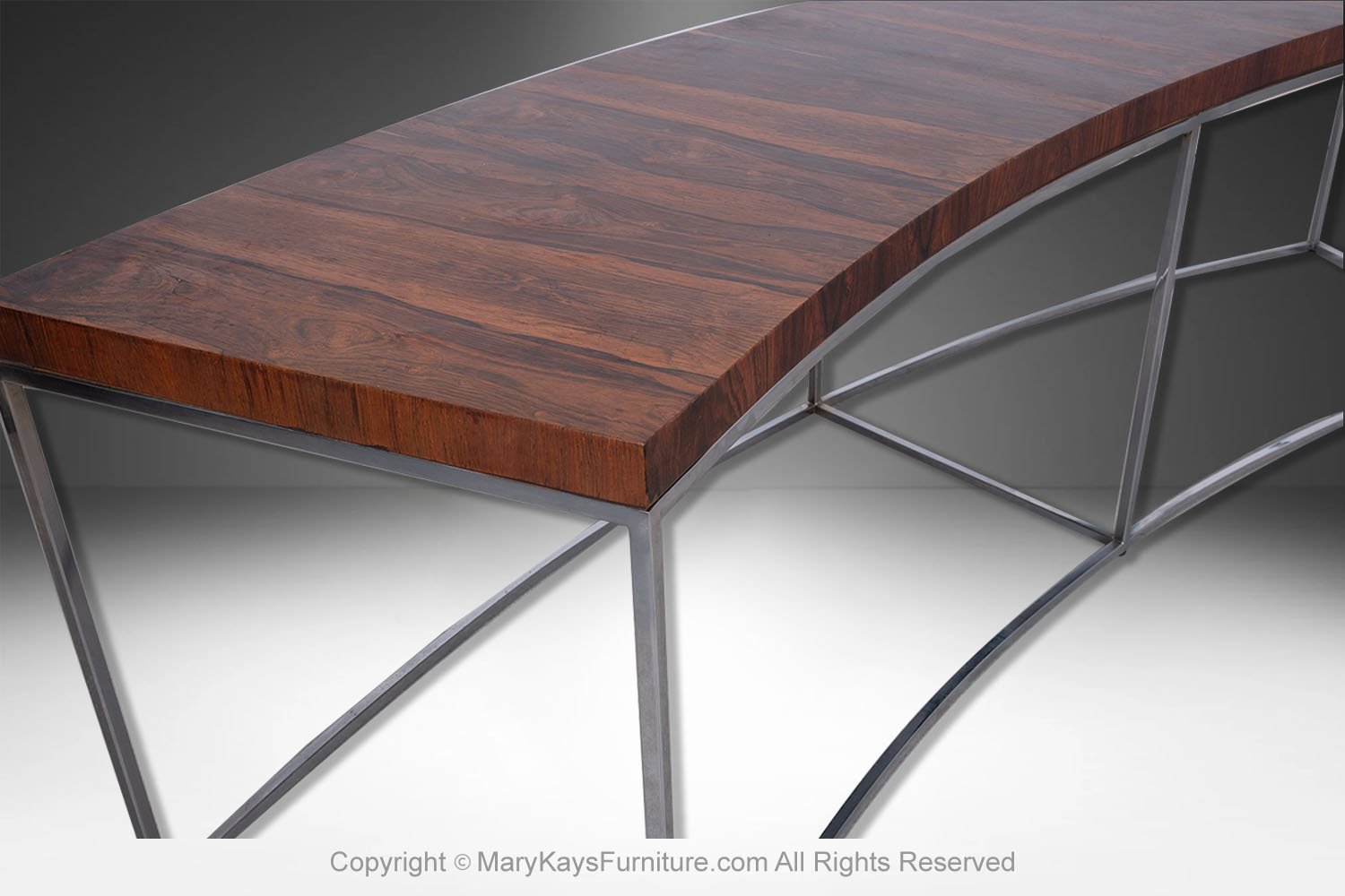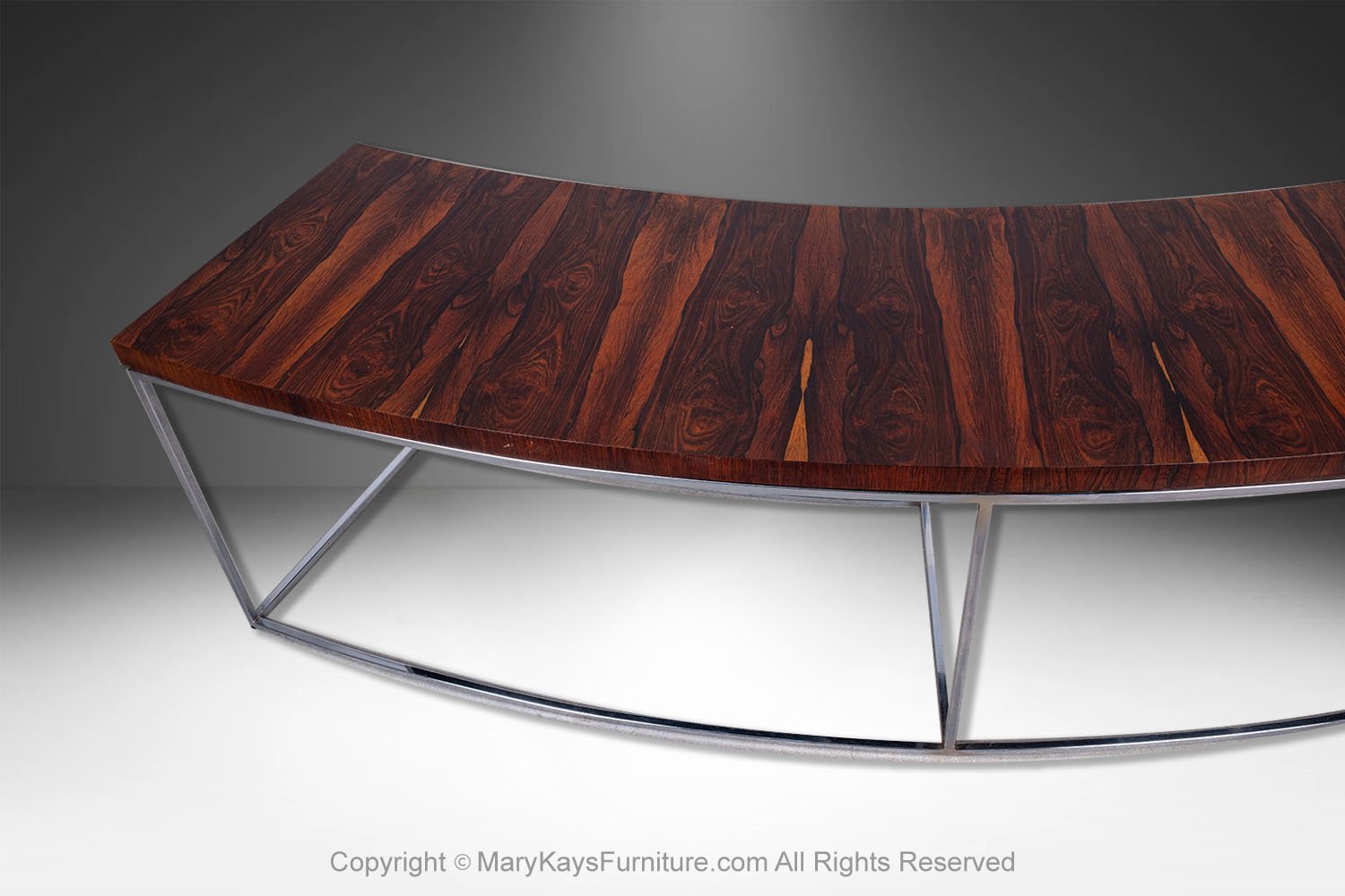A handsome, sleek Modern curved console, sofa table / bench designed in the 1970’s by Milo Baughman made by Thayer Coggin. An exceptional table both for its form and quality. Featuring a beautifully curved tabletop in rosewood veneer, resting on a polished square chrome steel frame, creating an elegantly sleek profile. Versatile and minimalistic in design, this console sofa table will blend with any style of décor; as a welcoming addition to an entryway or placed behind a sofa. It can also be used behind our Milo Baughman curved sofa sold separately.