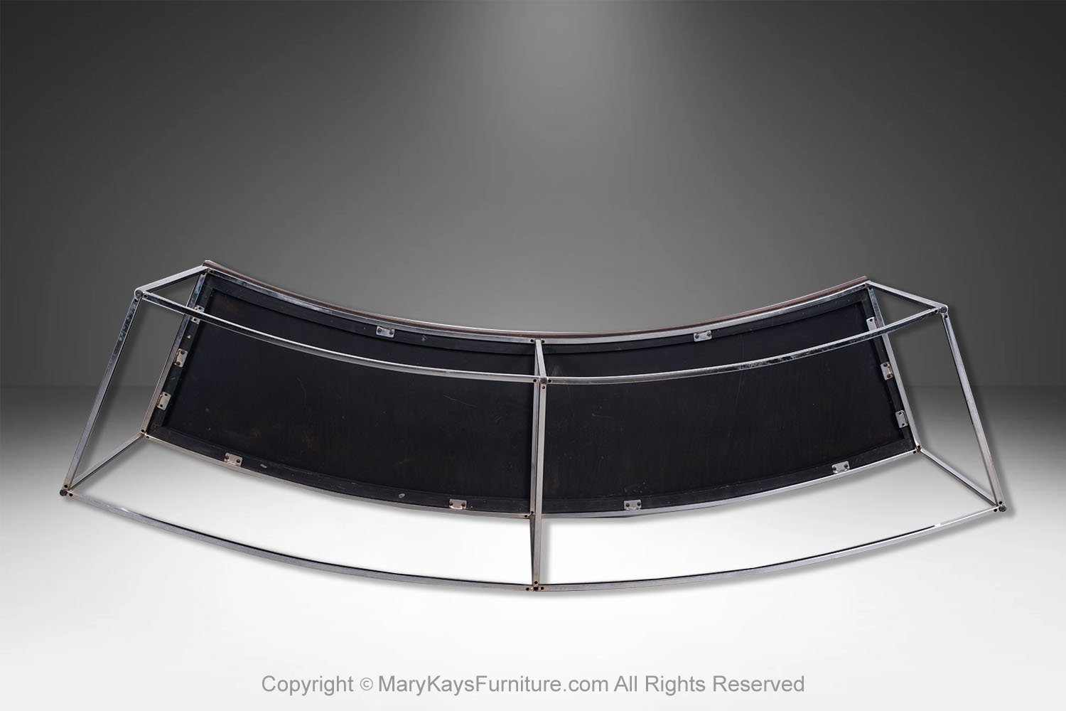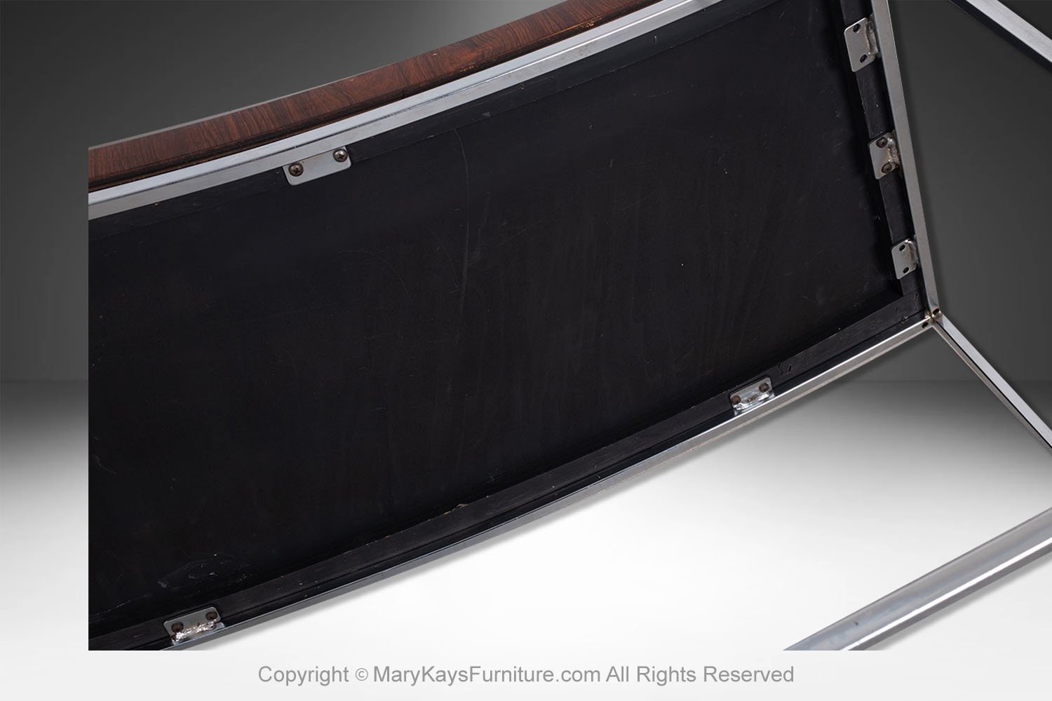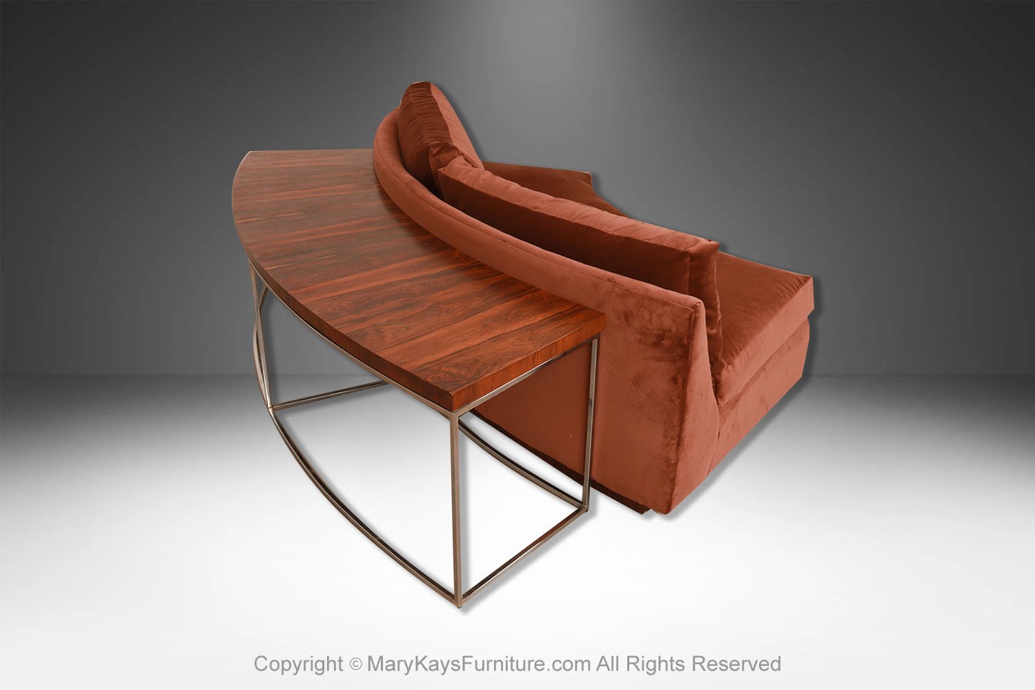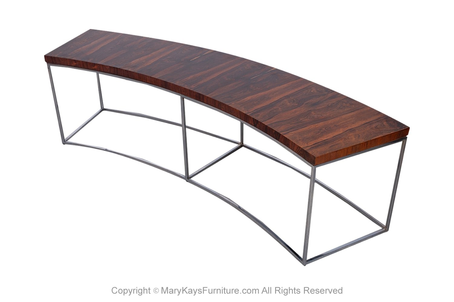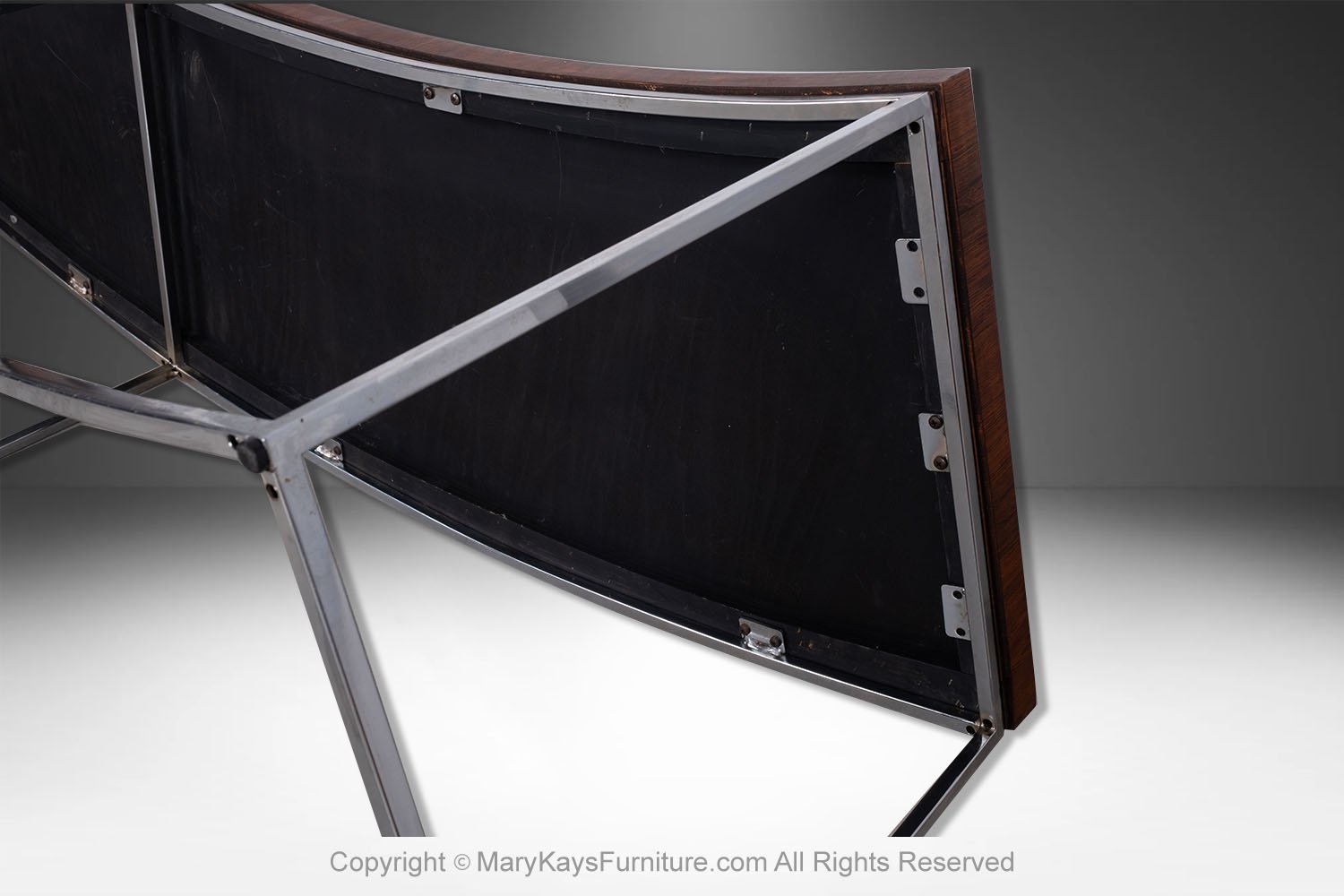 A handsome, sleek Modern curved console, sofa table / bench designed in the 1970’s by Milo Baughman made by Thayer Coggin. An exceptional table both for its form and quality. Featuring a beautifully curved tabletop in rosewood veneer, resting on a polished square chrome steel frame, creating an elegantly sleek profile. Versatile and minimalistic in design, this console sofa table will blend with any style of décor; as a welcoming addition to an entryway or placed behind a sofa. It can also be used behind our Milo Baughman curved sofa sold separately.