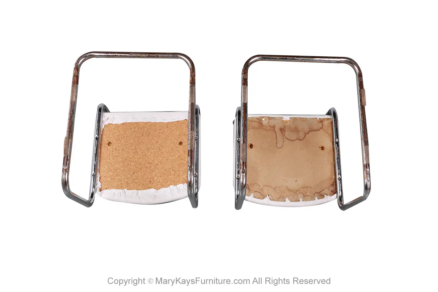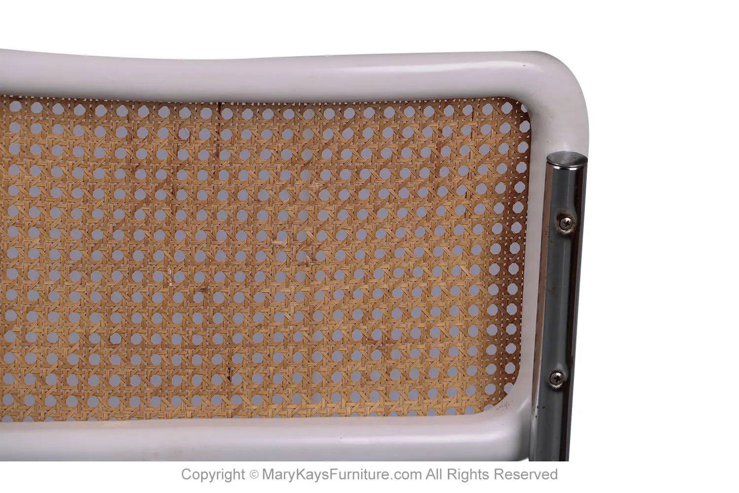 An attractive stylish pair of Mid Century Cane Bentwood Cantilever Chairs, based on a design by Marcel Breuer. Features a beautiful modernist chrome cantilever design, crafted of wood and hand-woven cane back inserts, tubular chromed frames with curved caned back panels, white vinyl upholstered cushion seats. The chairs are built to last the test of time and remain firm in all joints, making a gorgeous visual statement for the modern home. These chairs will certainly be a fine addition to any mid-century décor. nCondition Report: Structurally sound and very comfortable seating, overall good condition. Chair retains the original caning in good condition. The upholstery is in good condition, no tears. n nIn the Period: Mid-Century Modern nPlace of Origin: United States nDate of Manufacture: 1970s nMaterials and Techniques: Chrome, Cane nCondition: Very good nMeasurements: 32.5_ tall x 22_ deep x 20_ wide seat height 17.75_ n n