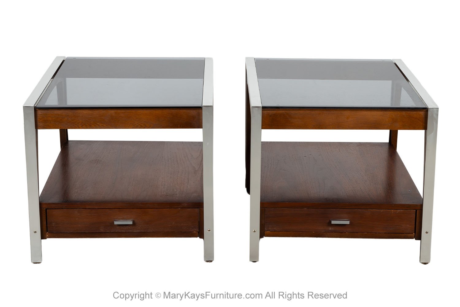 Introducing a stunning pair of mid-century Walnut, Aluminum and smoked Glass side/ end tables, inspired by the iconic designs of Milo Baughman. Crafted from walnut veneer, the warm tones of the wood beautifully complement the sleek aluminum frame, adding a touch of sophistication to any living space. Each with a lower shelf and drawer. The tables are square, with smoked glass tops, enhancing the table’s aesthetic appeal but also creates an illusion of spaciousness, making them ideal for both cozy and expansive rooms. The pair is designed to be a striking focal point and a versatile surface for your favorite books, coffee cups, and decorative accents, with clean lines and minimalist style, seamlessly fitting into contemporary and vintage-inspired interiors alike. Elevate your home decor with these exquisite tables that effortlessly marries form and function, bringing timeless elegance to your living space. Also, available for sale is a matching coffee table, (sold separately). nCondition Report: Frames in good structural condition, no chips to the glass, glass top, light scratches on the glass and chrome. n nIn the Style of: Milo Baughman (Designer) nIn the Style of: Mid-Century Modern nDate of Manufacture: 1970s nPeriod: 1970-1979 nMaterials and Techniques: Chrome, Walnut, Glass nCondition: Good nMeasurements: 20 1/4_ Height x 22 1/2_ Wide x 28 1/4_ Deep n n