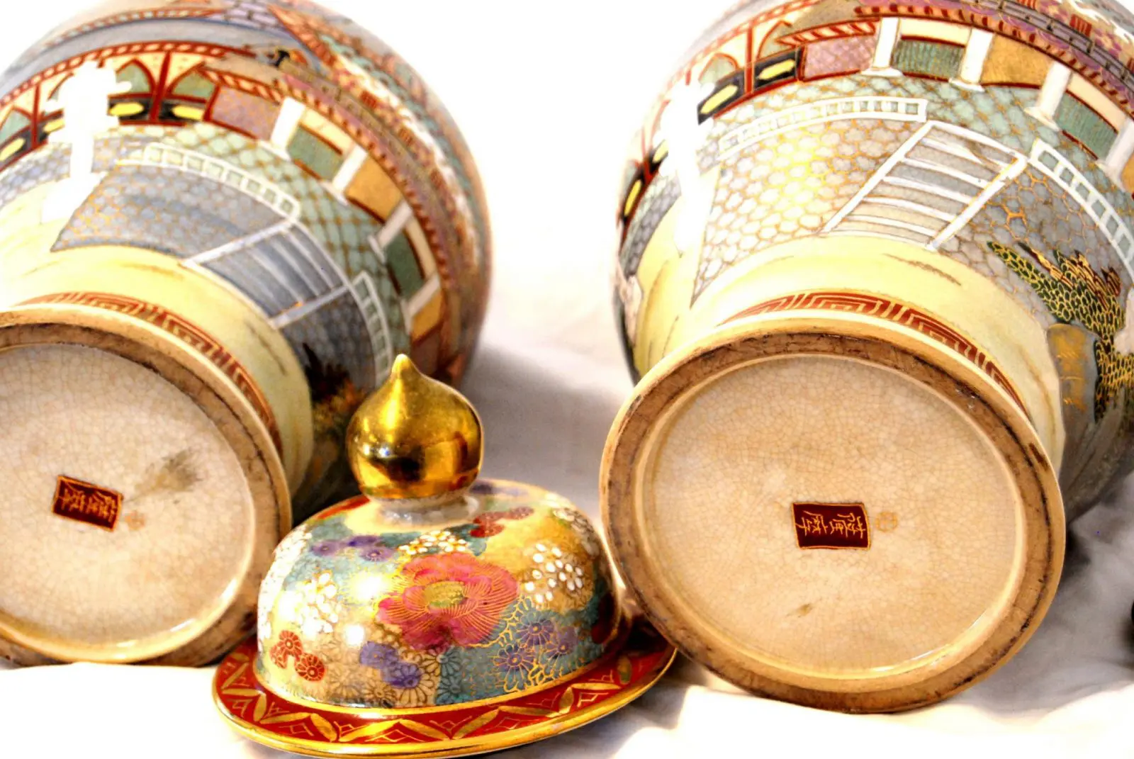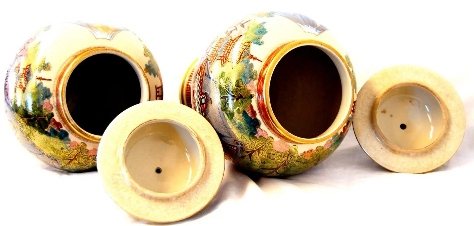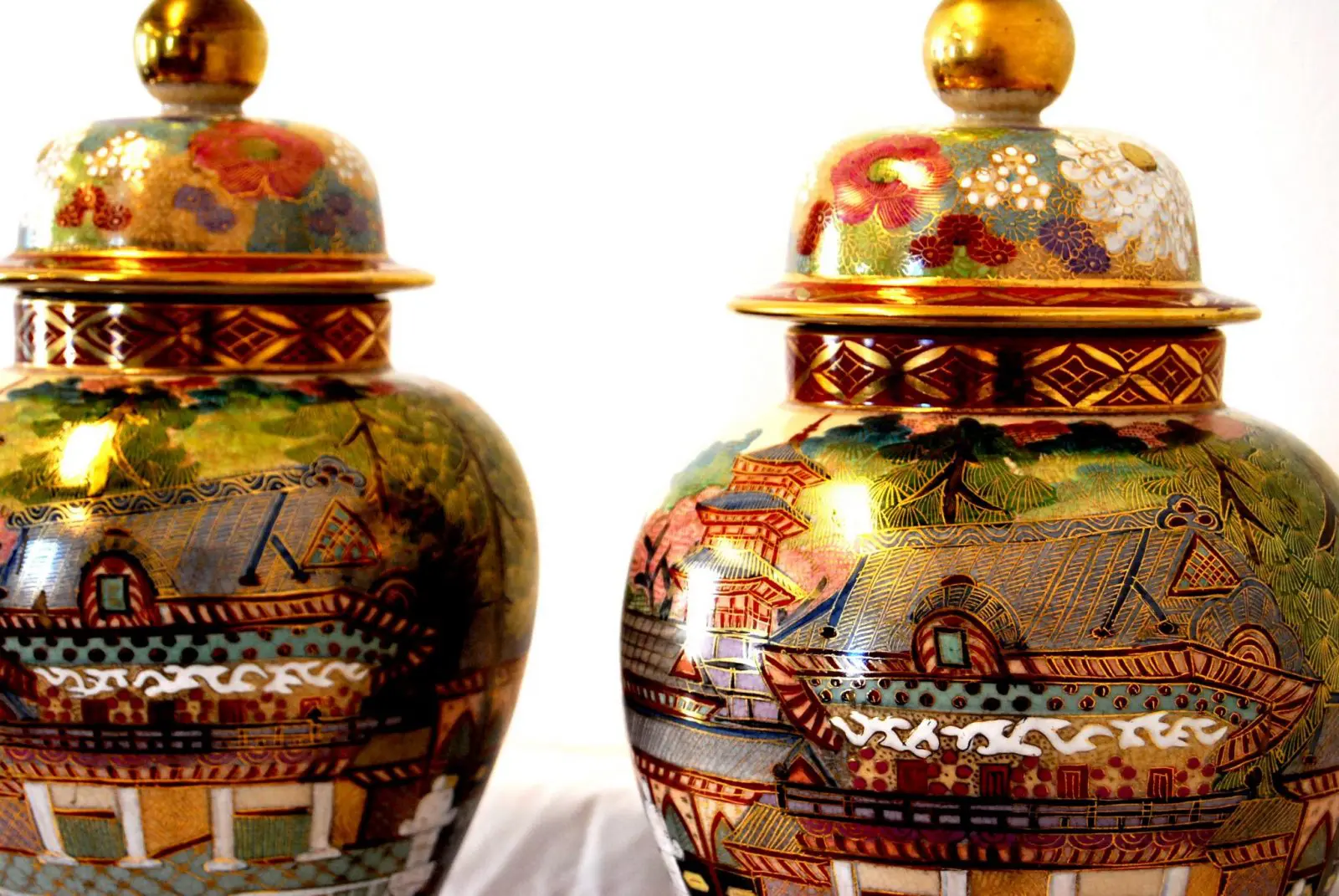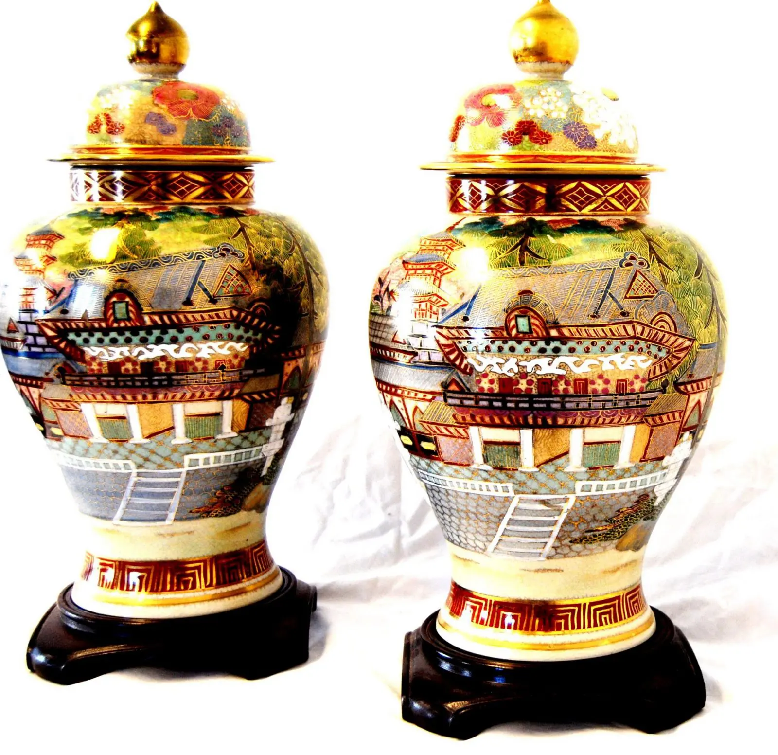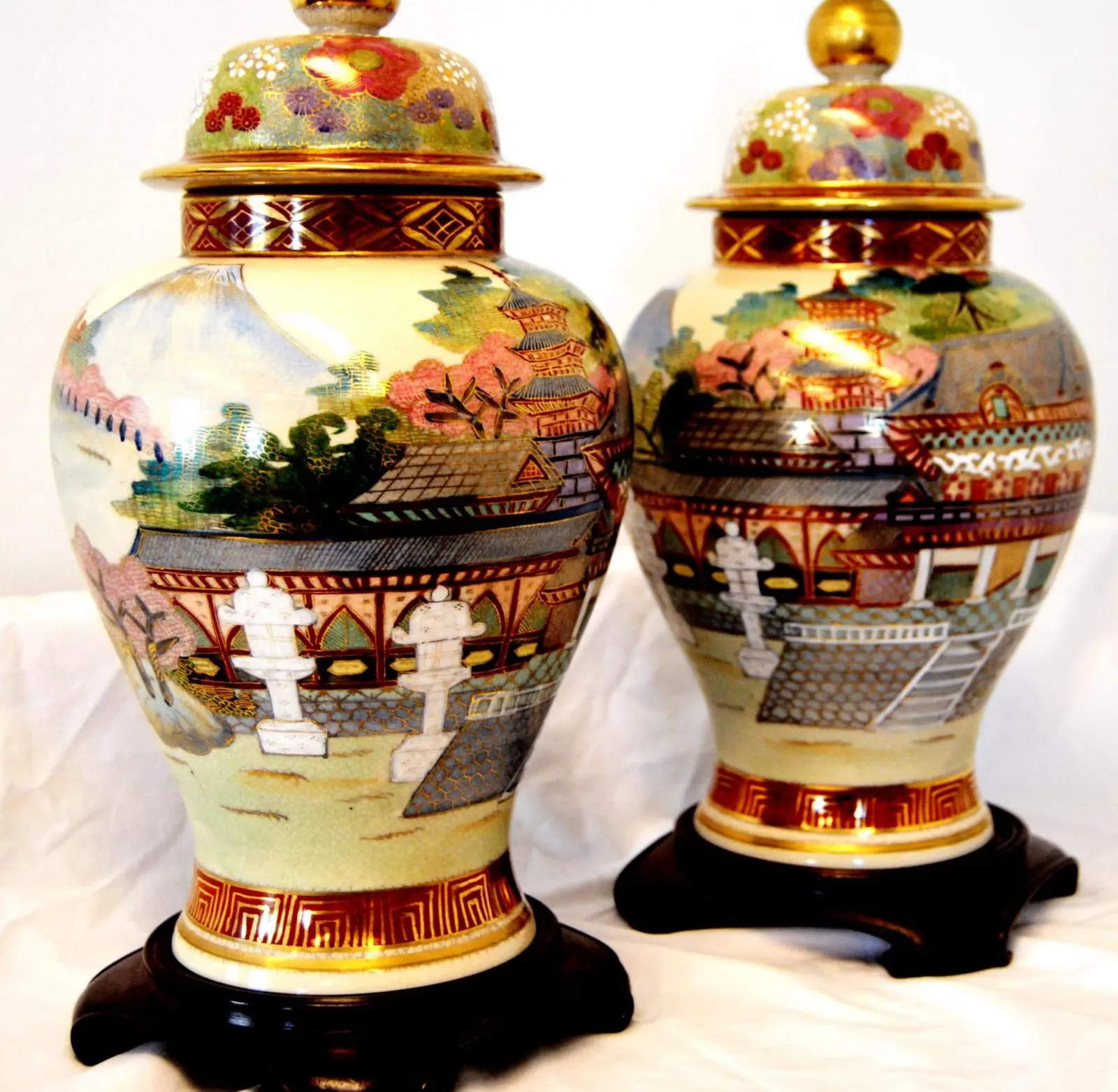Pair of Japanese porcelain covered jars in the Satsuma manner, having pagoda and mountainous landscape decoration, good crackle glaze and guilt highlightsn