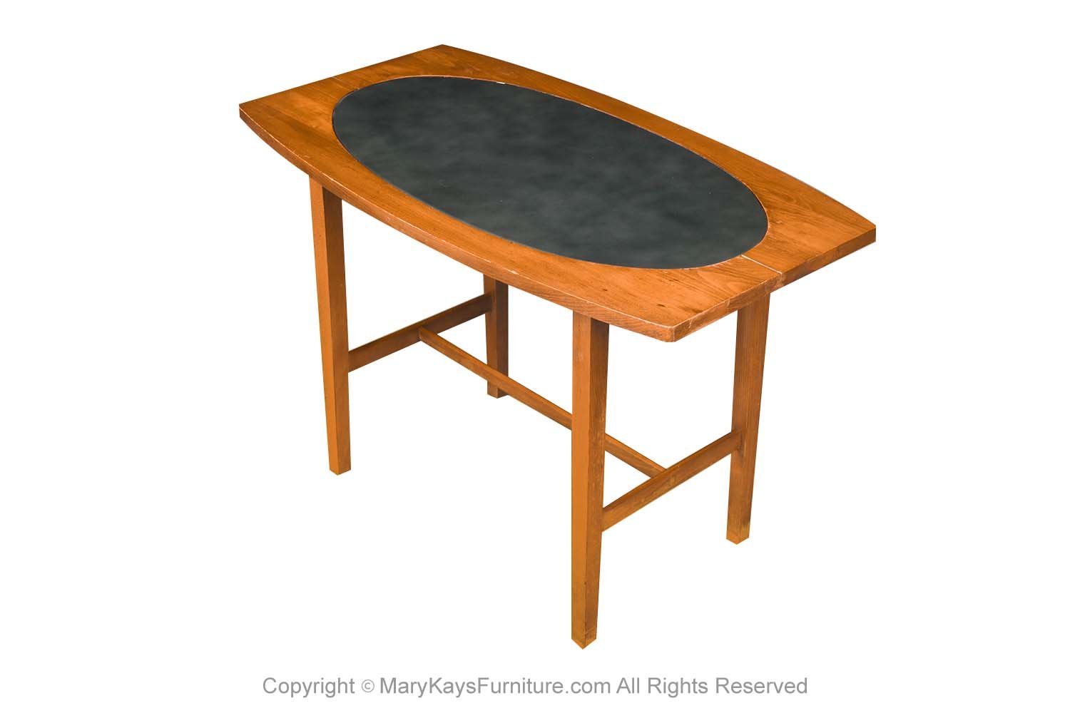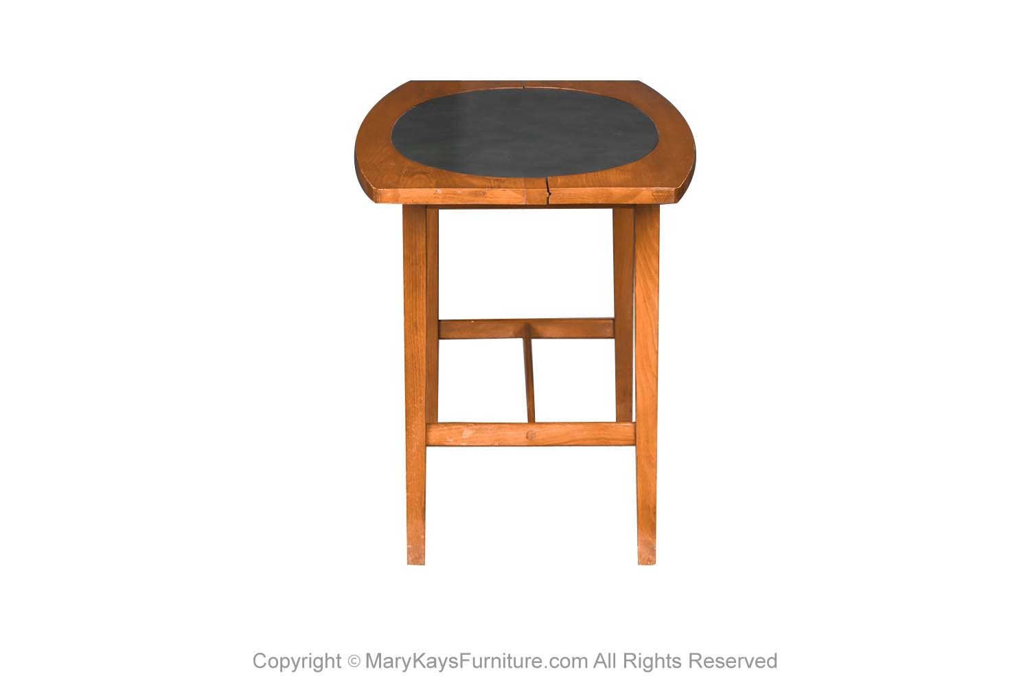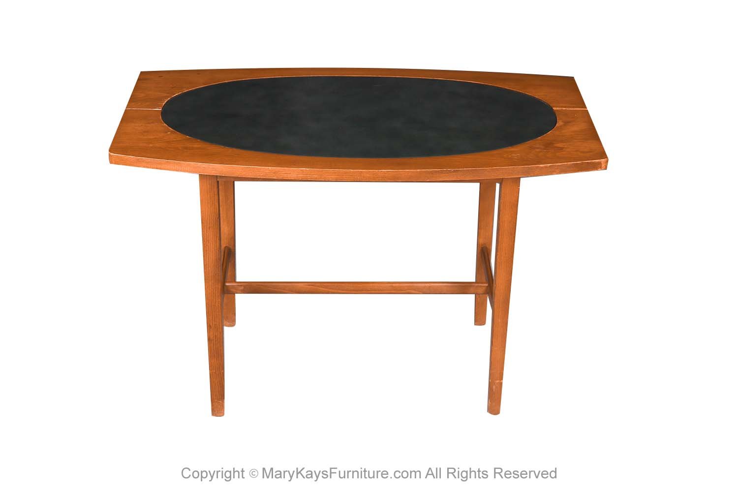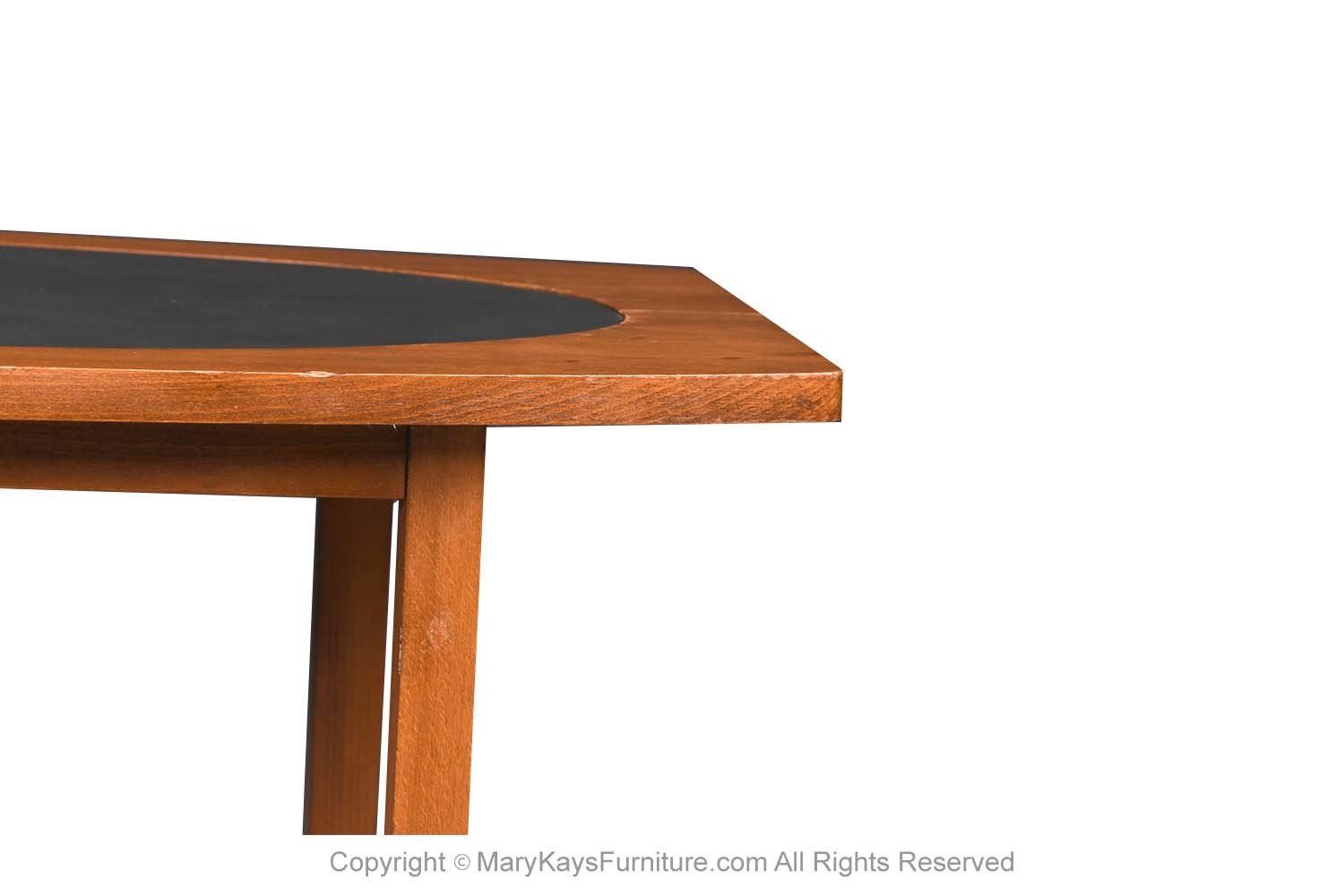 Spectacular 1960s rare mid century end/ side table designed by Paul McCobb for Winchendon Furniture Company, 1960’s “Perimeter Group”. Features an oval shaped top in beautifully grained walnut with black leather oval inset center. The table stands on four round tapered walnut legs with H shaped stretcher base. Makers label on underside (Perimeter Group designed by Paul McCobb Winchendon Furniture Company). Finely crafted, this line was very limited, and produced for only a short time. This beautiful table will make a wonderful addition to any mid-century modern décor. nCondition Report: Original finish, exhibit little signs of wear, overall gorgeous surface condition. Construction is strong and sturdy. n nCreator: Paul McCobb (Designer) nOf the Period: Mid-Century Modern nPlace of Origin: United States nDate of Manufacture: 1960s nPeriod: 1960-1969 nMaterials and Techniques: Walnut, leather inlay nCondition: good nWear: Wear consistent with age and use nMeasurements: 20_ tall x 31 1/8_ wide x 17_ deep n n