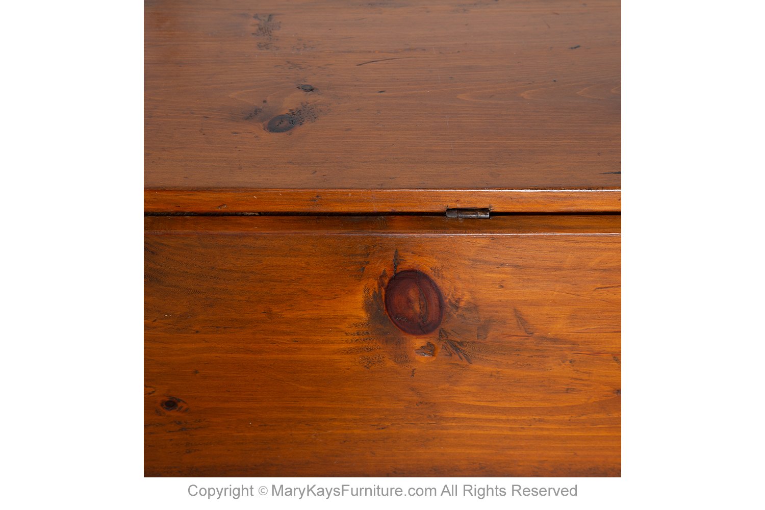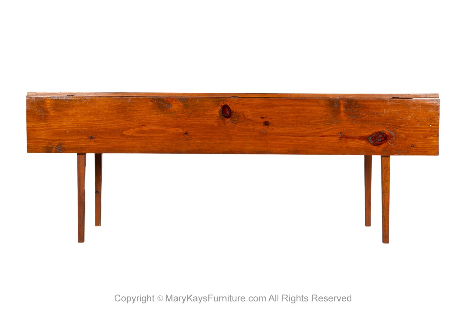 A vintage rustic pine drop leaf 6 ft 6″ long dining table, with magnificent natural knots in the pine wood, in good condition throughout. Features rectangular top offering multiple expansion possibilities with two side / paneled form drop-hinged leaves, with pull out rods to support each leaf. Keep the leaves down and conserve valuable space or raise them to function as a dining table. Each wing of the table can be easily flipped up to provide an extra 10 7/8″ on each side – up to 77 7/8_ long total with added leaves. When closed completely, it is reduced to a mere 22 7/8_ table which allows for the table to be tucked away if needed. The legs slightly taper towards the bottom. The flexibility of this piece is endless, used as sofa table, hall table, console table and dining table. nCondition Report: The beautiful top displays a nice patina, exhibits little signs of wear, with typical scuffs, overall gorgeous surface condition. Construction is strong and sturdy. n nCreator: Unknown nStyle: American Colonial (in the style) nOf the Period: 19th century nMaterials and Techniques: Wood nCondition: Distressed nWear: Wear consistent with age and use nMeasurements: 77 7/8_ wide x 22 7/8″ deep (both leaves down) x 28 7/8_ tall Fully extended with both leaves out 431/4″ deep n n