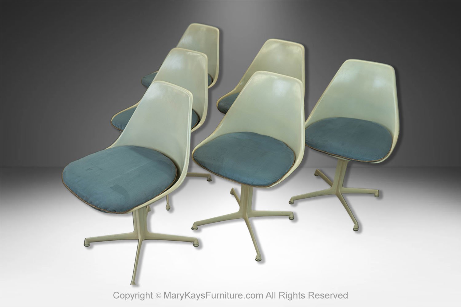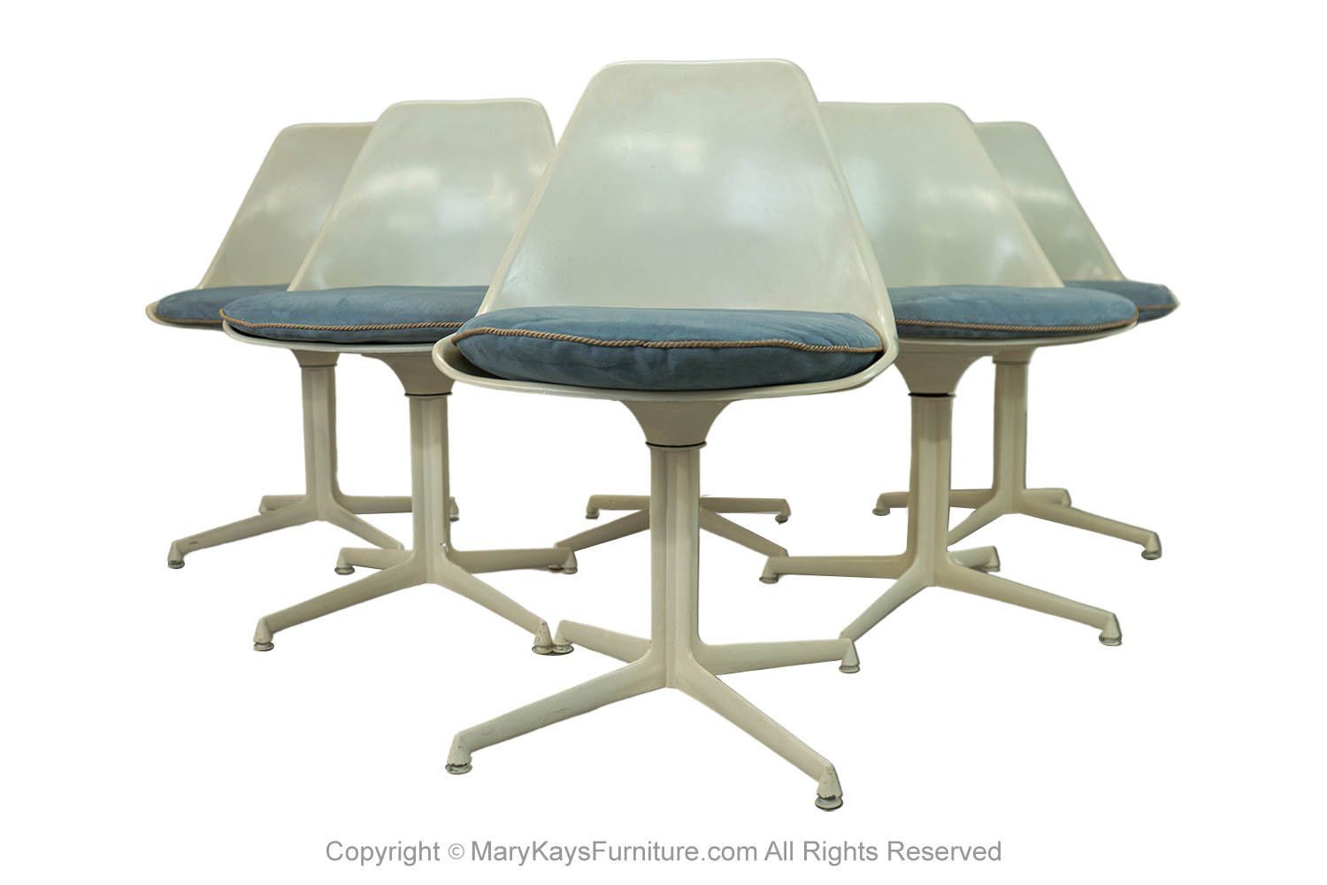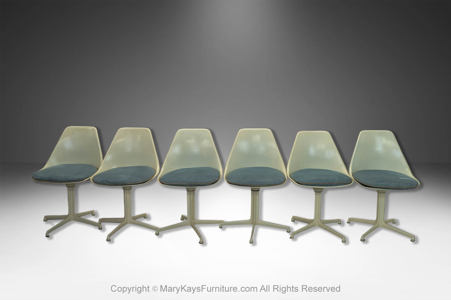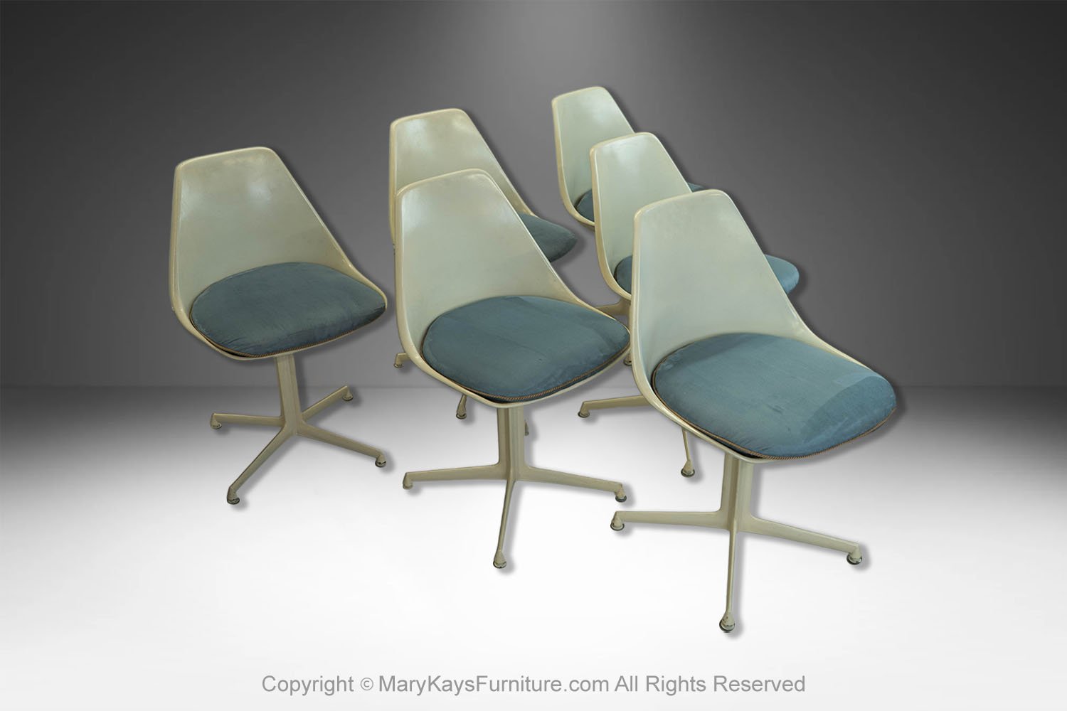 This set of six mid-century modern armless, side, dining chairs, manufactured by Burke reflect the strong influence of the iconic “Tulip Chair” by Eero Saarinen. The chairs feature a molded white fiberglass form with original removable blue cushions. resting on a swivel base with four legs. The bottom of each chair is marked “Burke, Inc. Dallas, TX”. Chairs are very sturdy and swivel, they all are stamped on the base. An elegant and iconic design with its distinctive tulip shape. This time-honored example of mid-century modern design can be incorporated into virtually any decorating style for additional seating in any room of your home or office effortlessly. Also available is a matching tulip table sold separately.