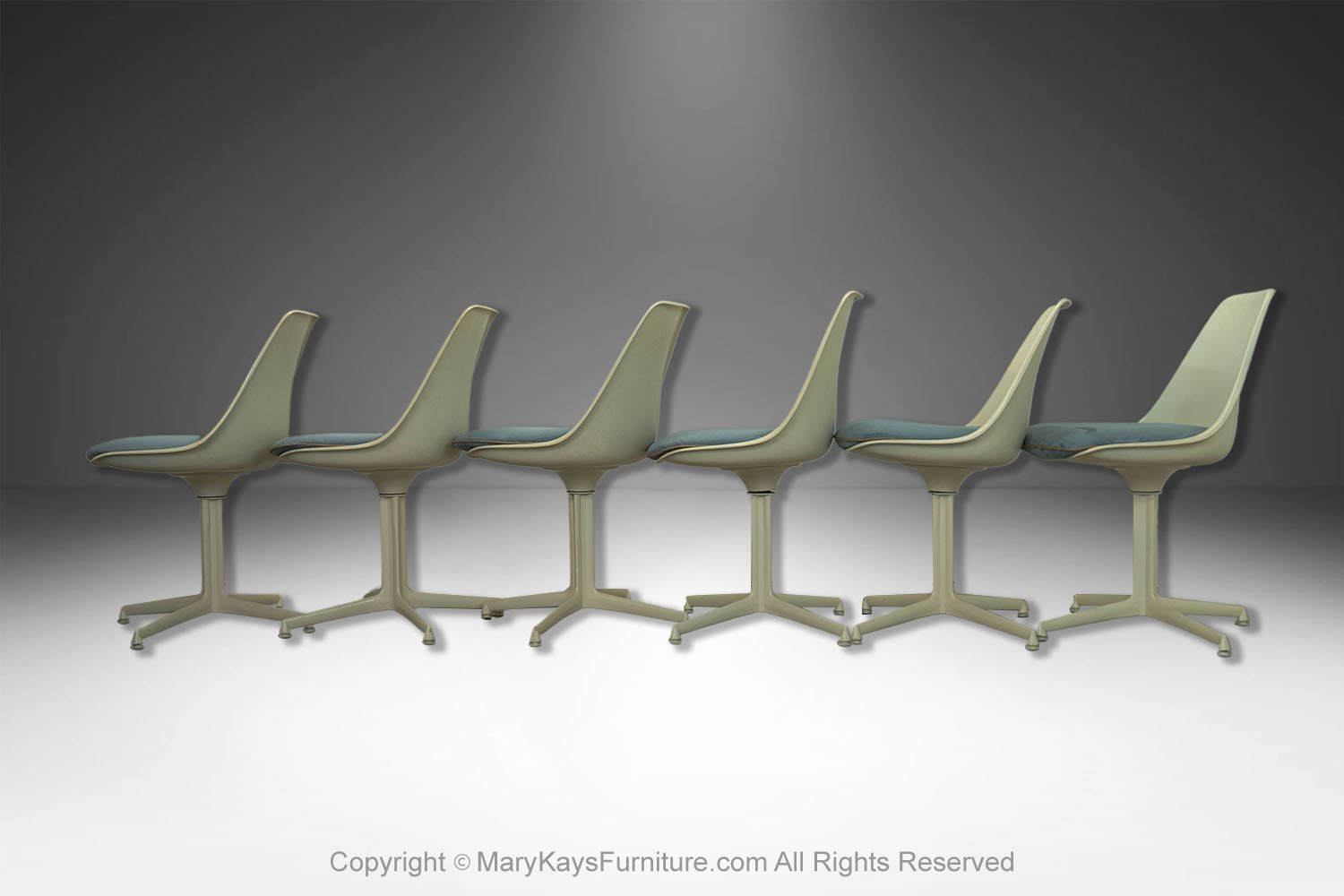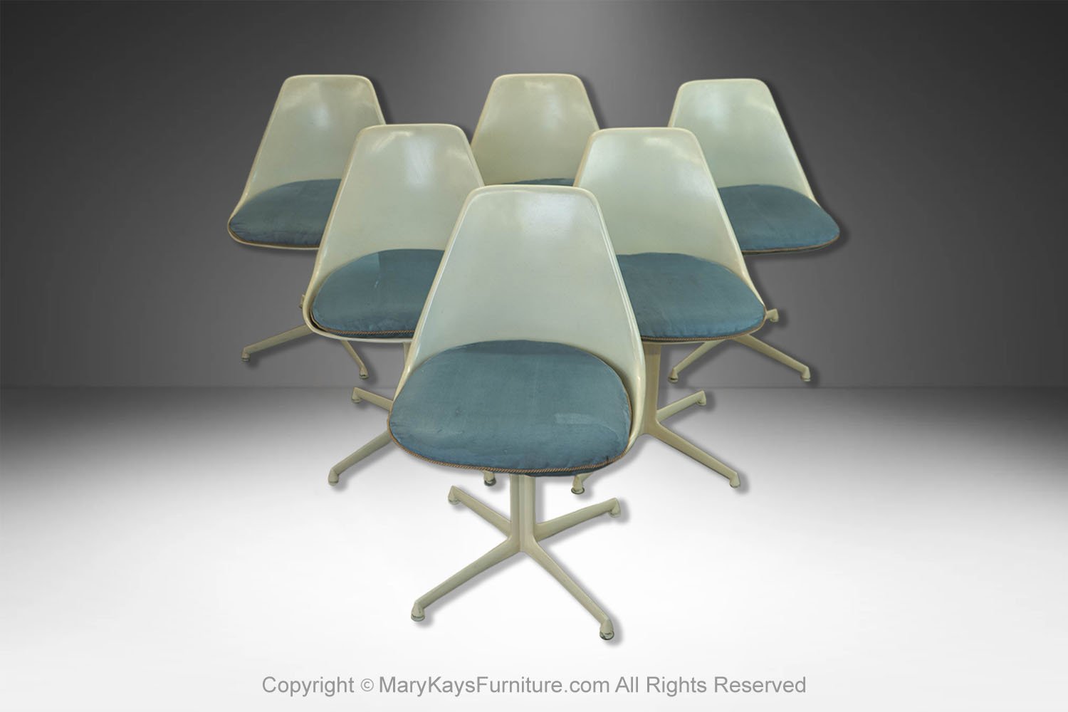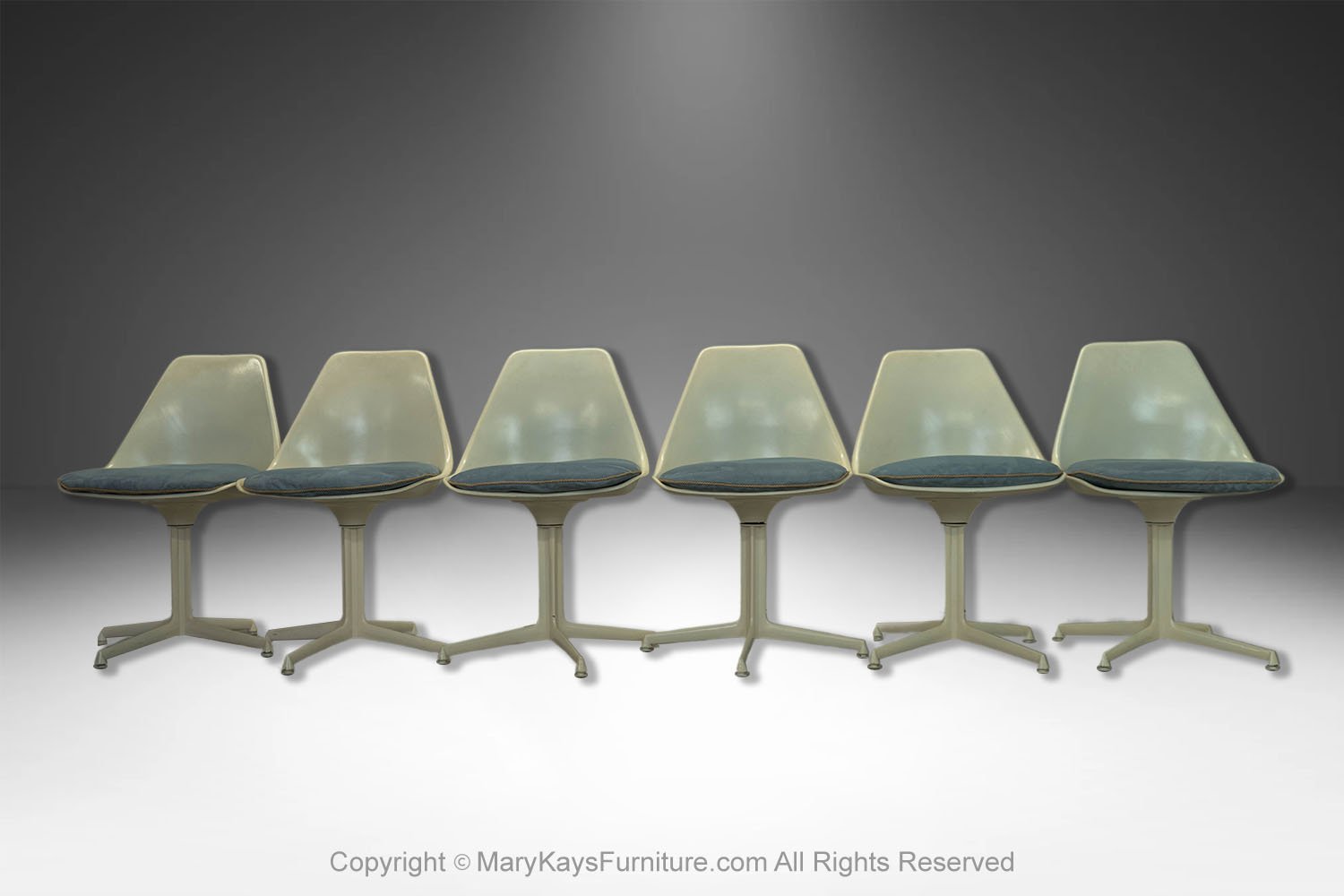 This set of six mid-century modern armless, side, dining chairs, manufactured by Burke reflect the strong influence of the iconic “Tulip Chair” by Eero Saarinen. The chairs feature a molded white fiberglass form with original removable blue cushions. resting on a swivel base with four legs. The bottom of each chair is marked “Burke, Inc. Dallas, TX”. Chairs are very sturdy and swivel, they all are stamped on the base. An elegant and iconic design with its distinctive tulip shape. This time-honored example of mid-century modern design can be incorporated into virtually any decorating style for additional seating in any room of your home or office effortlessly. Also available is a matching tulip table sold separately.