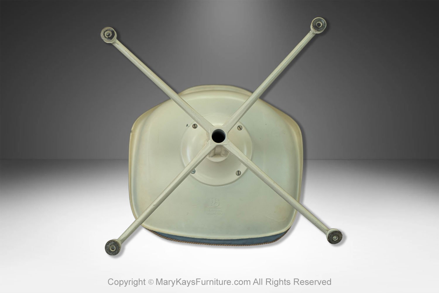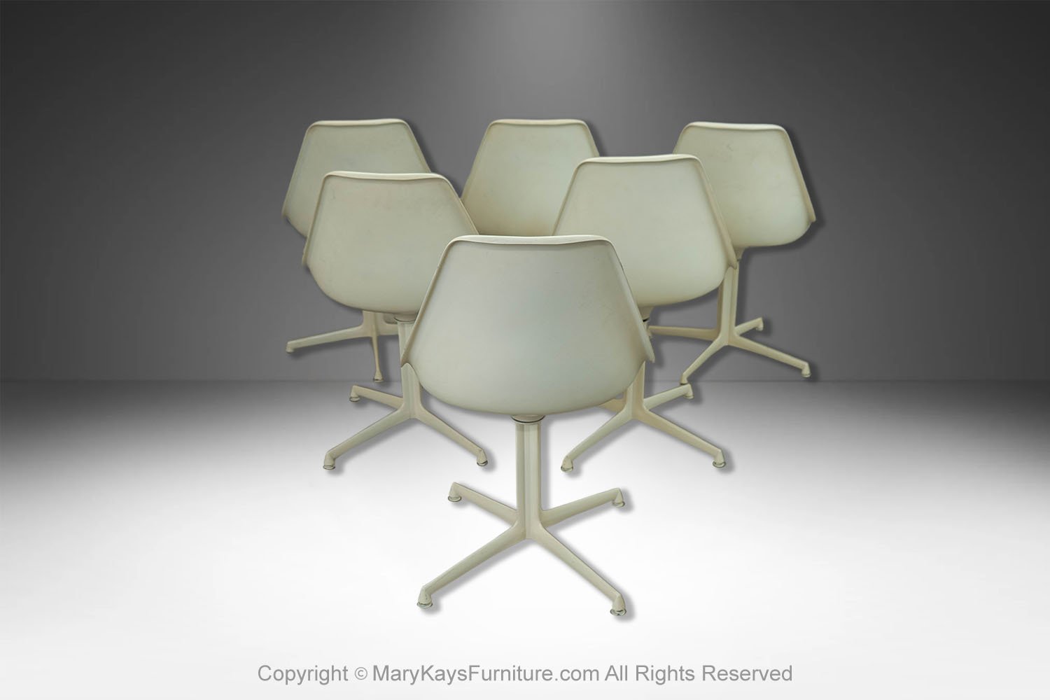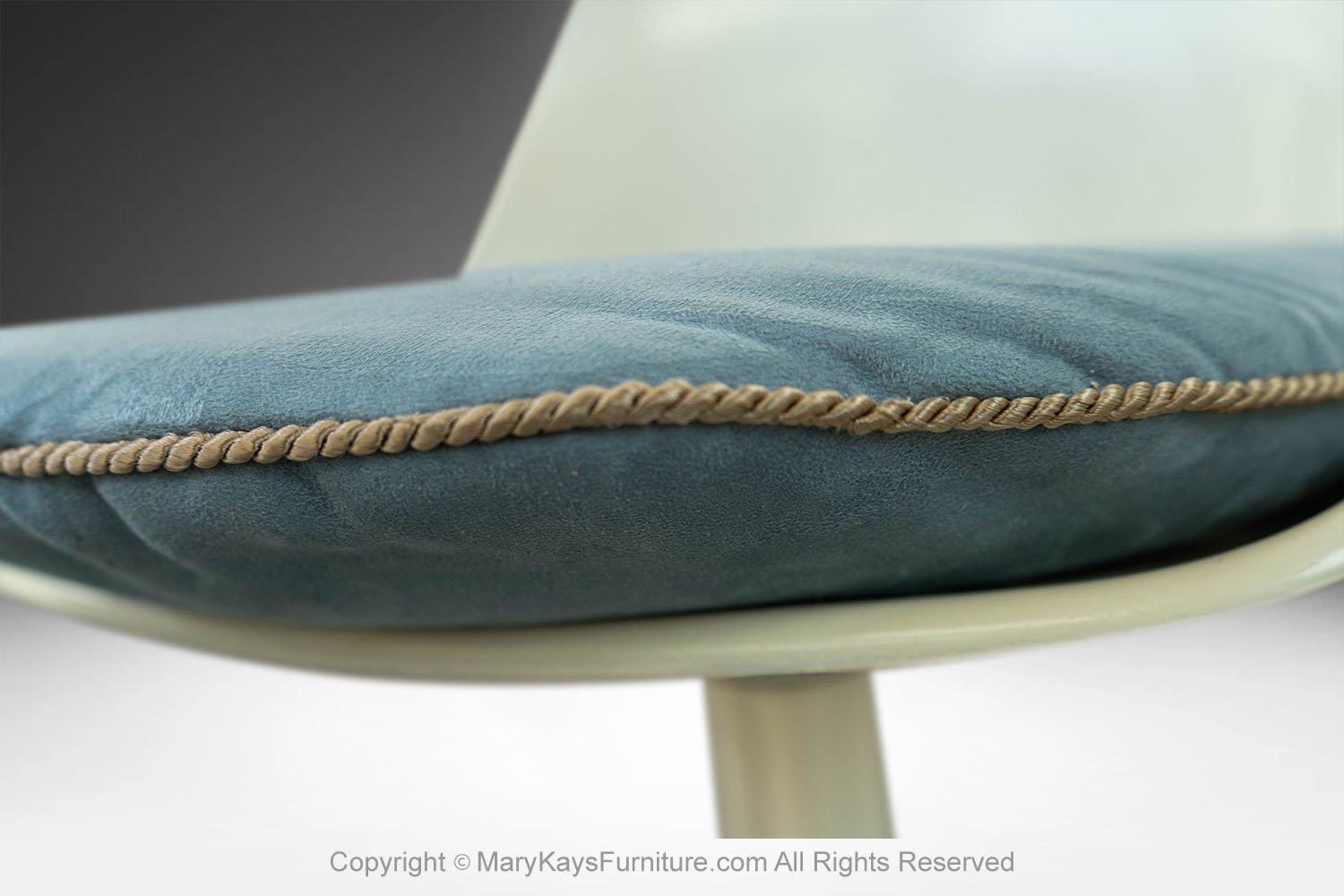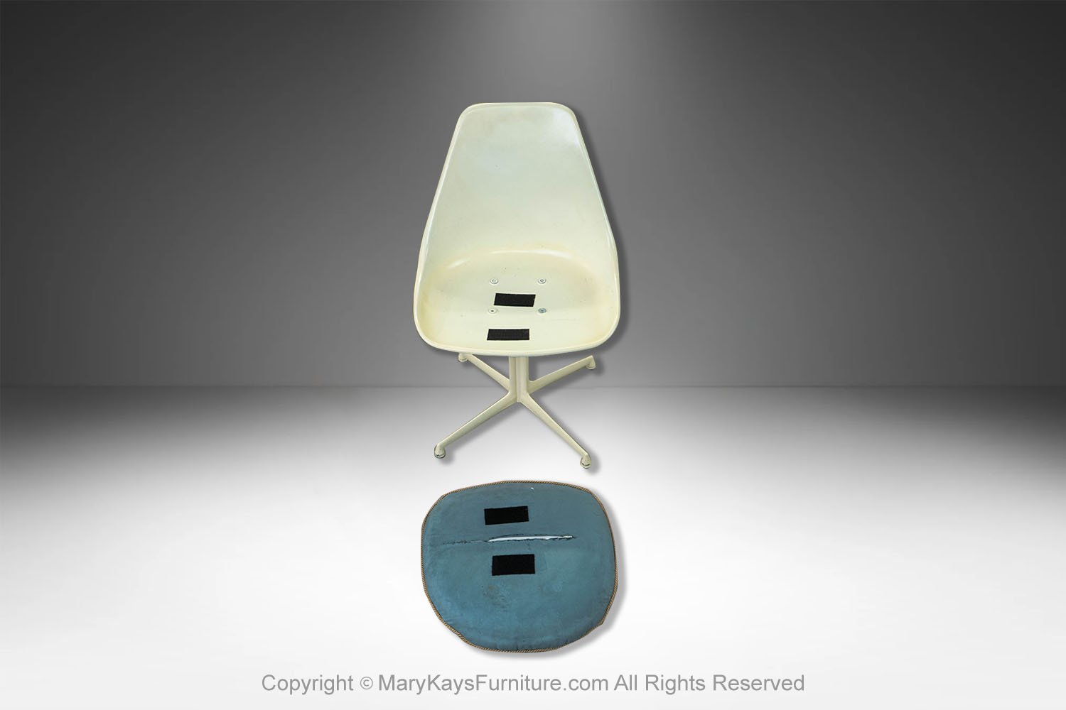 This set of six mid-century modern armless, side, dining chairs, manufactured by Burke reflect the strong influence of the iconic “Tulip Chair” by Eero Saarinen. The chairs feature a molded white fiberglass form with original removable blue cushions. resting on a swivel base with four legs. The bottom of each chair is marked “Burke, Inc. Dallas, TX”. Chairs are very sturdy and swivel, they all are stamped on the base. An elegant and iconic design with its distinctive tulip shape. This time-honored example of mid-century modern design can be incorporated into virtually any decorating style for additional seating in any room of your home or office effortlessly. Also available is a matching tulip table sold separately.