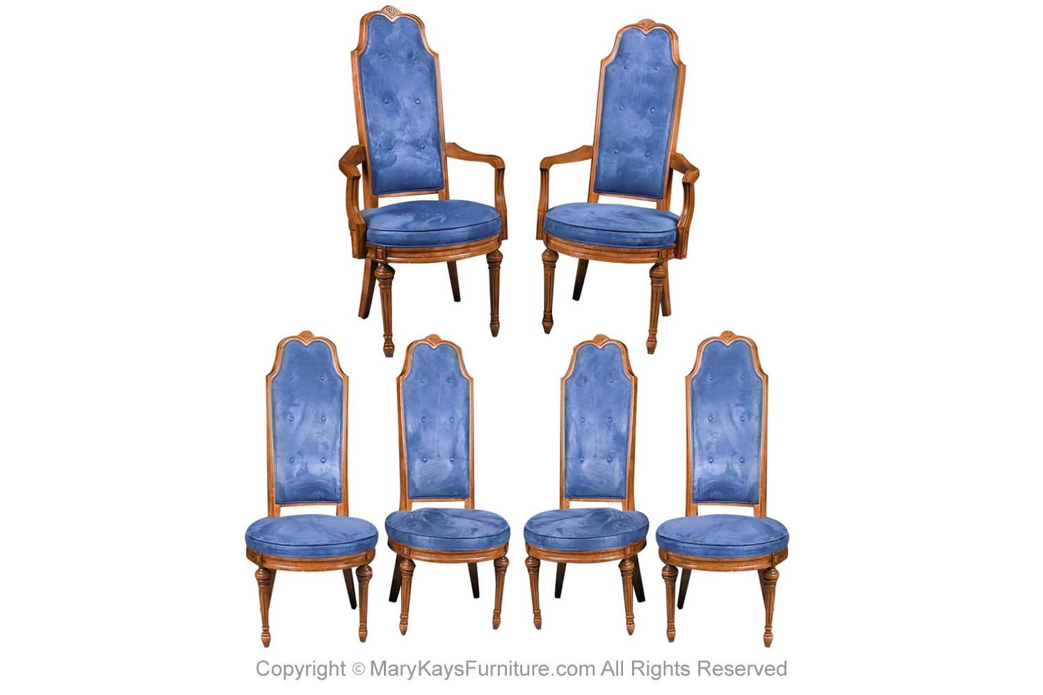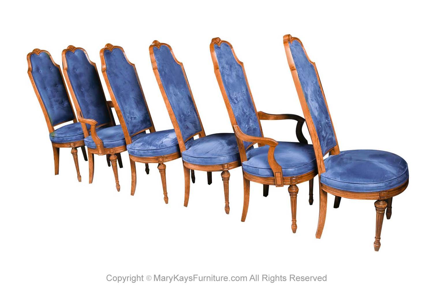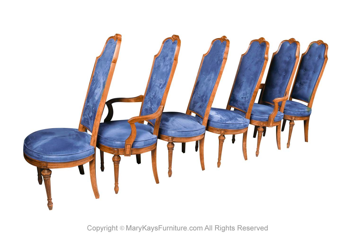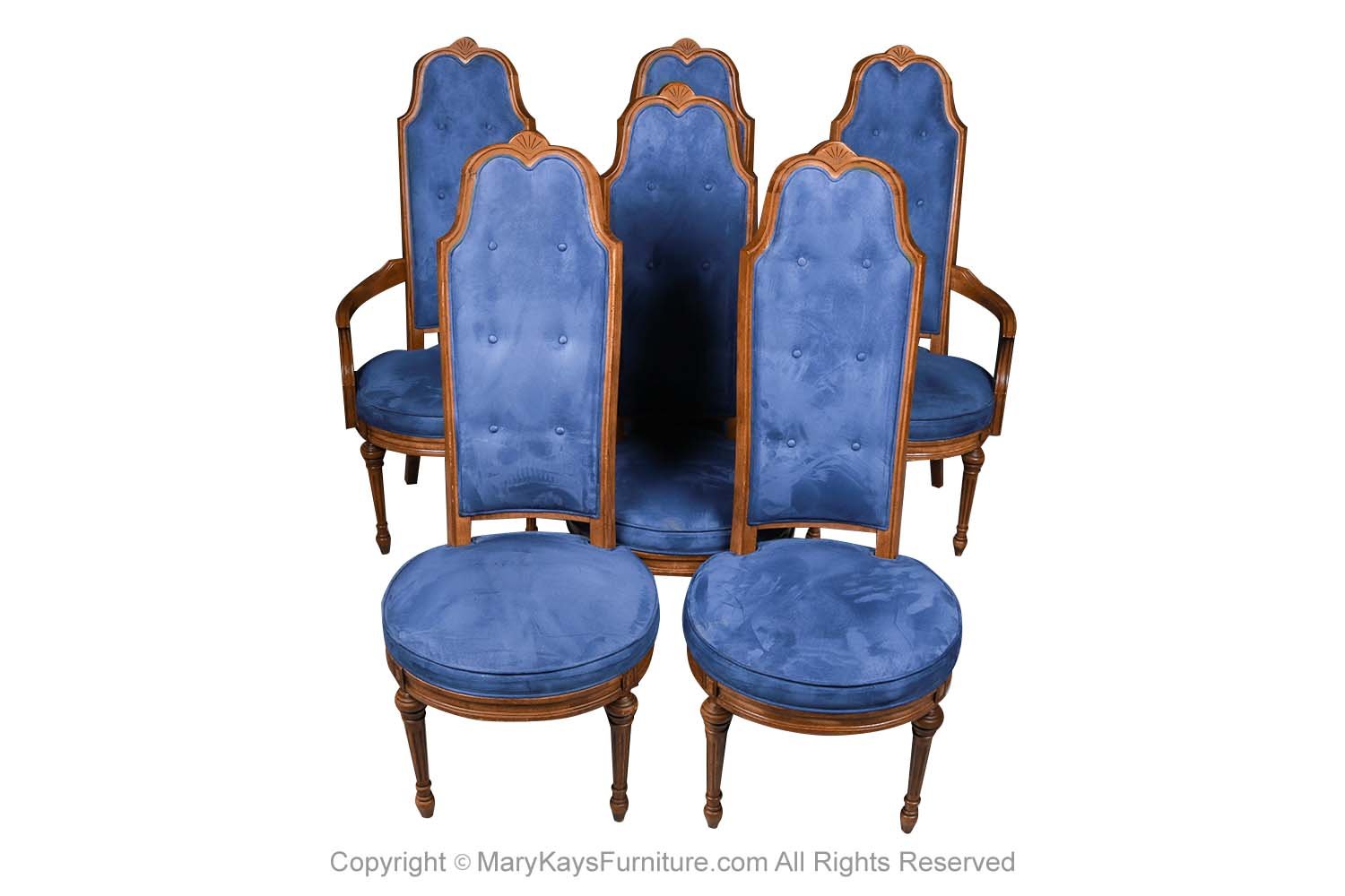 Set of six French Louis XVI style tall back dining chairs, two armchairs and four side chairs, circa 1960s. They feature carved walnut frames with fluted front legs, sabre back legs and curved back top rails with a central shell detail. The cobalt blue velvet upholstery is button tufted on both sides of the backrest. The circular seats add a modern element to the design. They are sturdy and in good vintage condition. They have been reupholstered by Josh Levin & Associates with no flaws to the velvet upholstery. nCondition Report: Original finish wear consistent with age and use, overall gorgeous surface condition. Construction is strong and sturdy. Original upholstery, no tears or rips in fabric. n n nStyle: Louis XVI nPlace of Origin: United States nDate of Manufacture: 1960’s nMaterials and Techniques: Walnut, Velvet Upholstery nCondition: Good nWear: Wear consistent with age and use nMeasurements: 21″ wide, 20″ deep, 48″ tall, seats 18″ tall, (arms 22″ wide) n n n