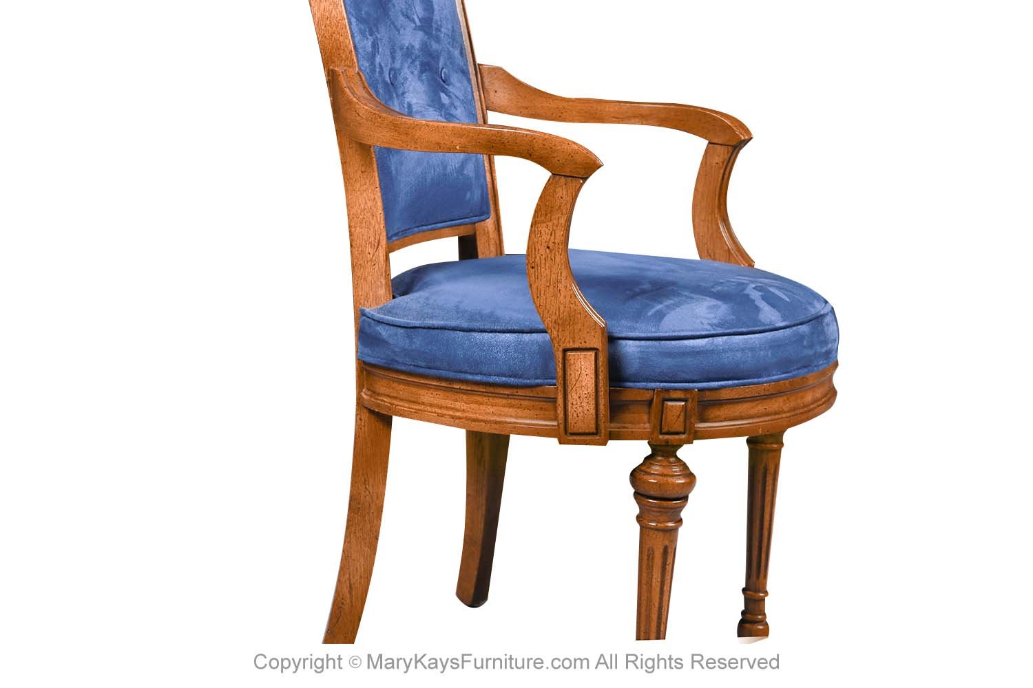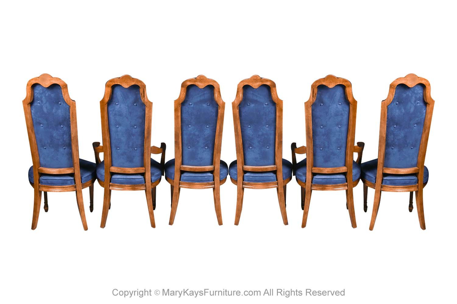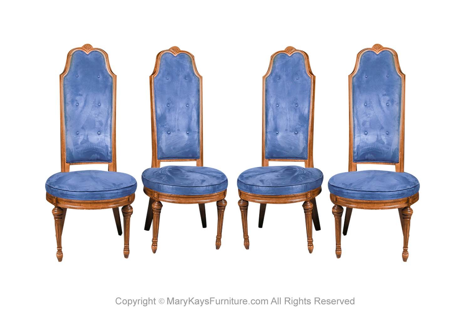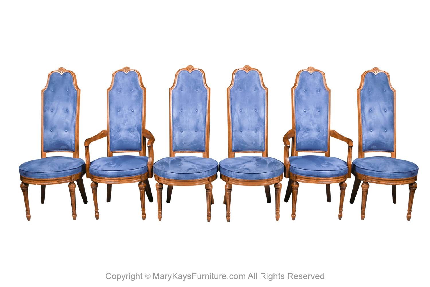 Set of six French Louis XVI style tall back dining chairs, two armchairs and four side chairs, circa 1960s. They feature carved walnut frames with fluted front legs, sabre back legs and curved back top rails with a central shell detail. The cobalt blue velvet upholstery is button tufted on both sides of the backrest. The circular seats add a modern element to the design. They are sturdy and in good vintage condition. They have been reupholstered by Josh Levin & Associates with no flaws to the velvet upholstery. nCondition Report: Original finish wear consistent with age and use, overall gorgeous surface condition. Construction is strong and sturdy. Original upholstery, no tears or rips in fabric. n n nStyle: Louis XVI nPlace of Origin: United States nDate of Manufacture: 1960’s nMaterials and Techniques: Walnut, Velvet Upholstery nCondition: Good nWear: Wear consistent with age and use nMeasurements: 21″ wide, 20″ deep, 48″ tall, seats 18″ tall, (arms 22″ wide) n n n