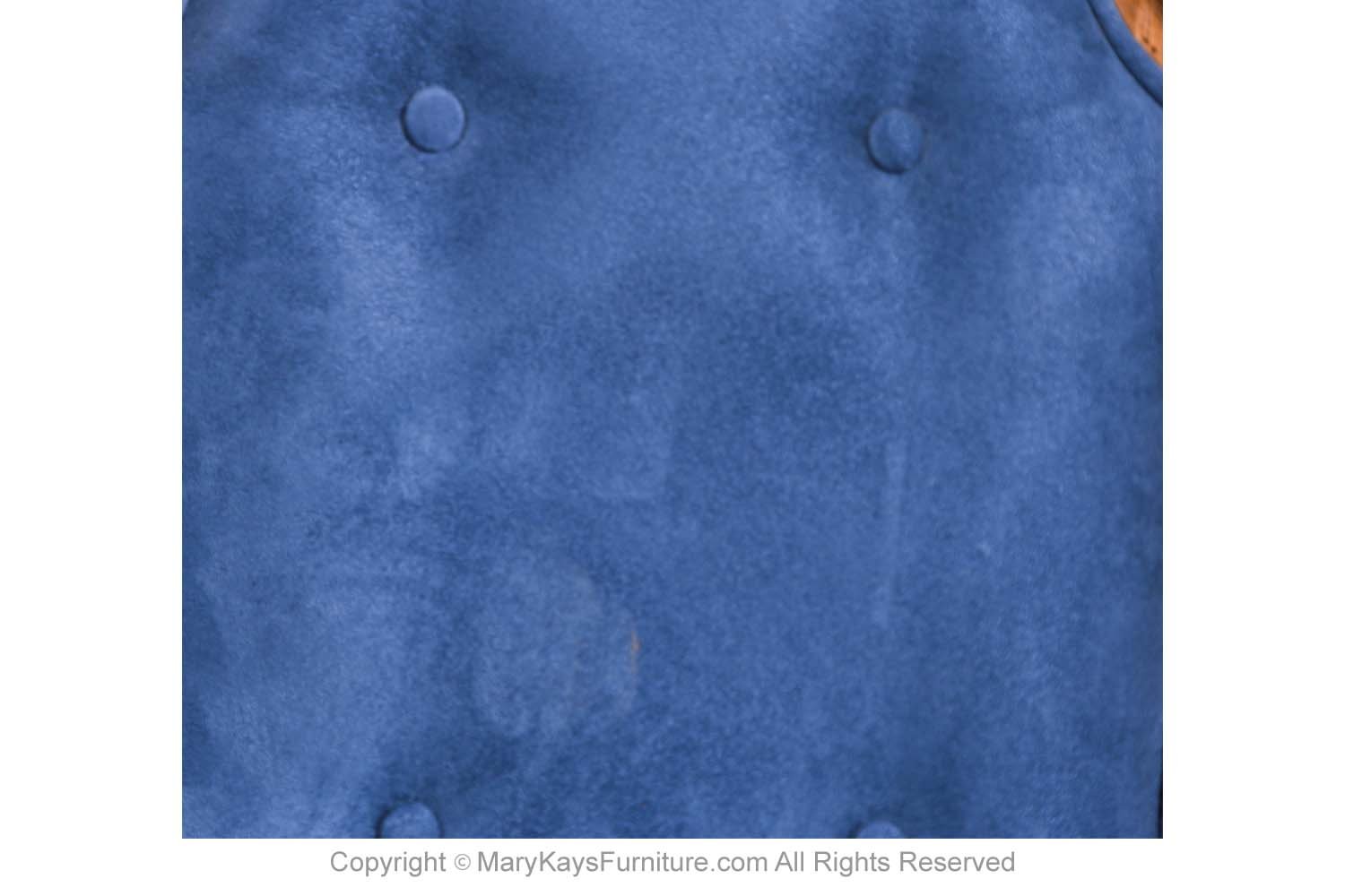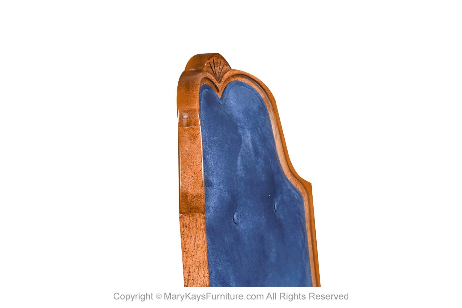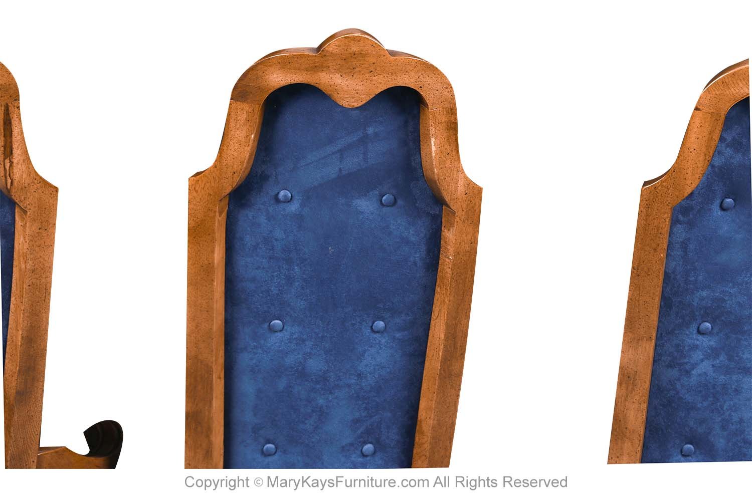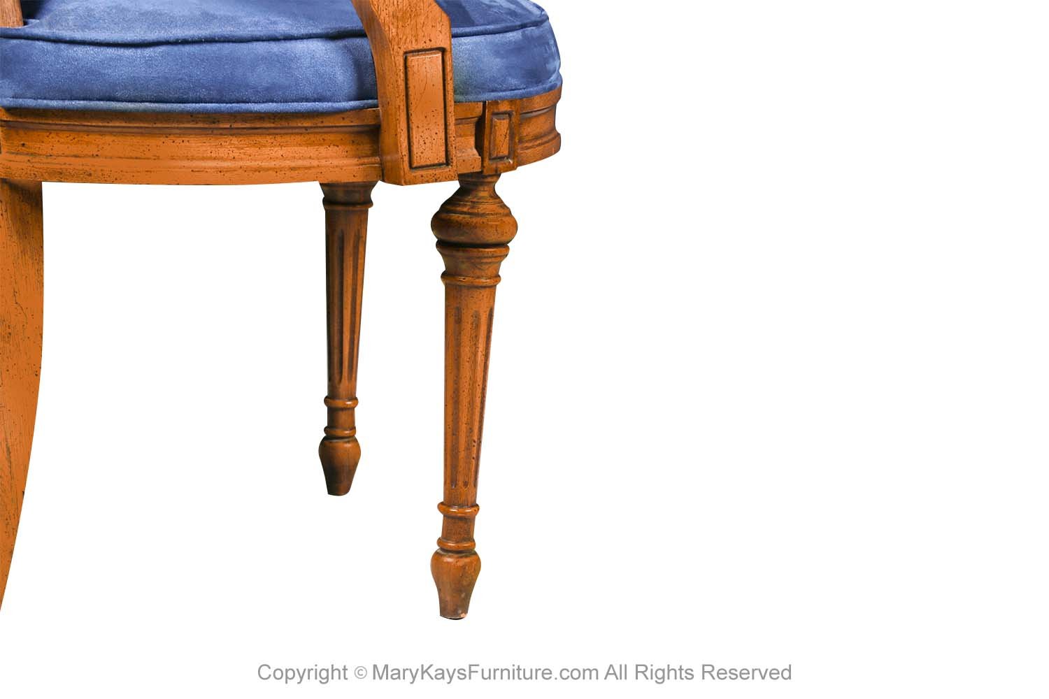 Set of six French Louis XVI style tall back dining chairs, two armchairs and four side chairs, circa 1960s. They feature carved walnut frames with fluted front legs, sabre back legs and curved back top rails with a central shell detail. The cobalt blue velvet upholstery is button tufted on both sides of the backrest. The circular seats add a modern element to the design. They are sturdy and in good vintage condition. They have been reupholstered by Josh Levin & Associates with no flaws to the velvet upholstery. nCondition Report: Original finish wear consistent with age and use, overall gorgeous surface condition. Construction is strong and sturdy. Original upholstery, no tears or rips in fabric. n n nStyle: Louis XVI nPlace of Origin: United States nDate of Manufacture: 1960’s nMaterials and Techniques: Walnut, Velvet Upholstery nCondition: Good nWear: Wear consistent with age and use nMeasurements: 21″ wide, 20″ deep, 48″ tall, seats 18″ tall, (arms 22″ wide) n n n
