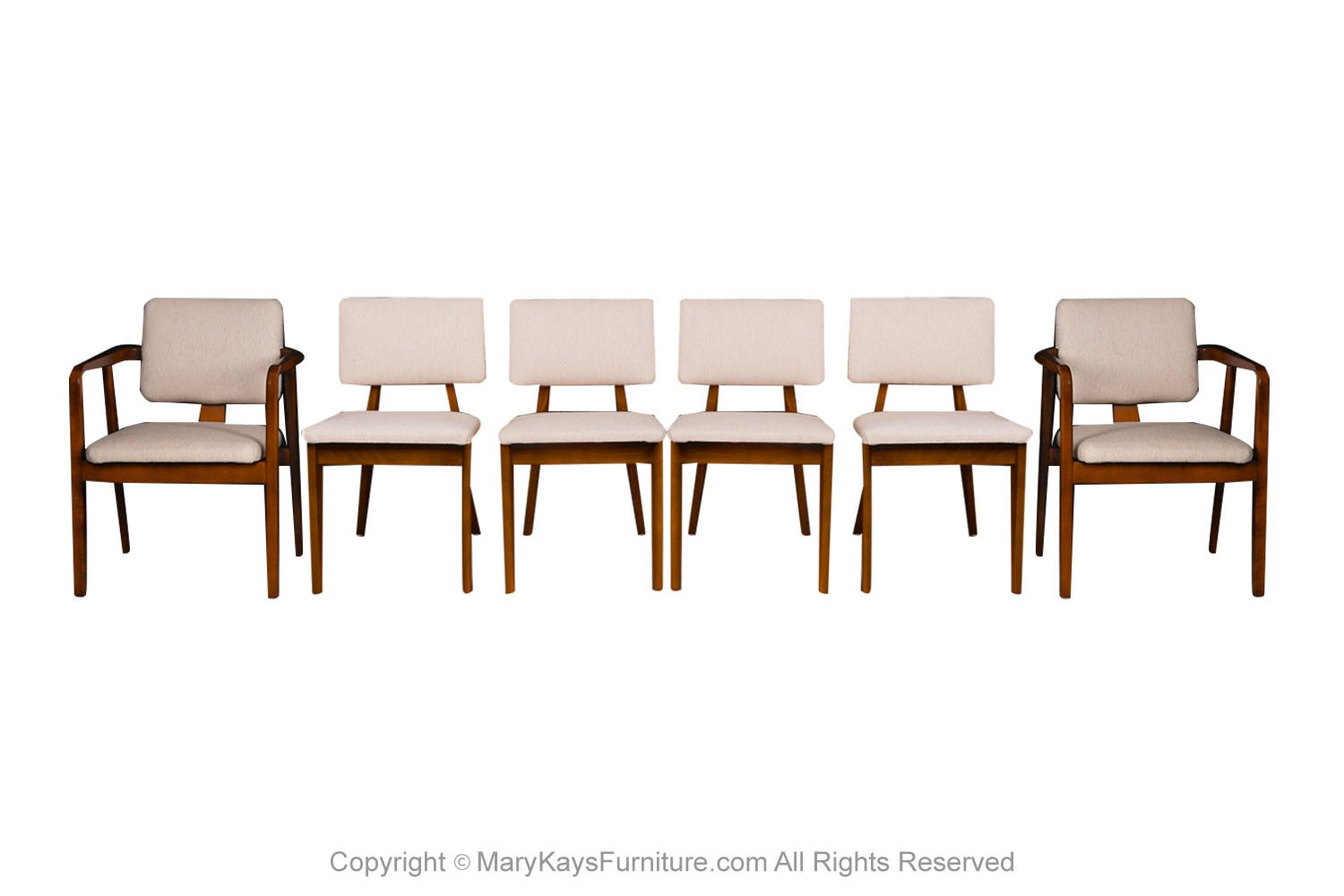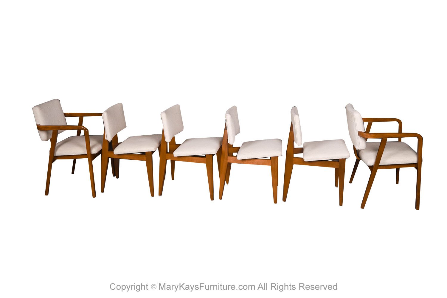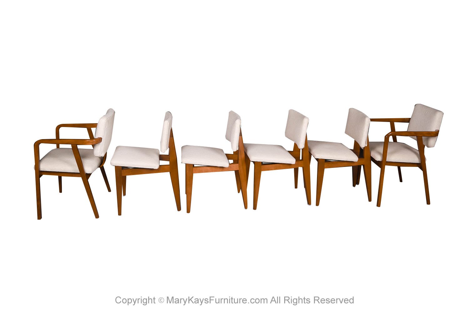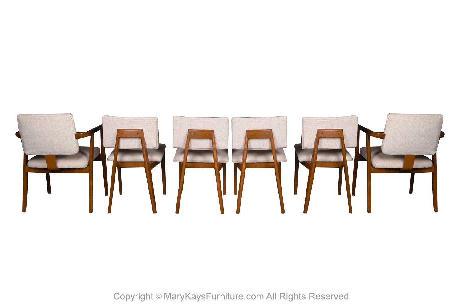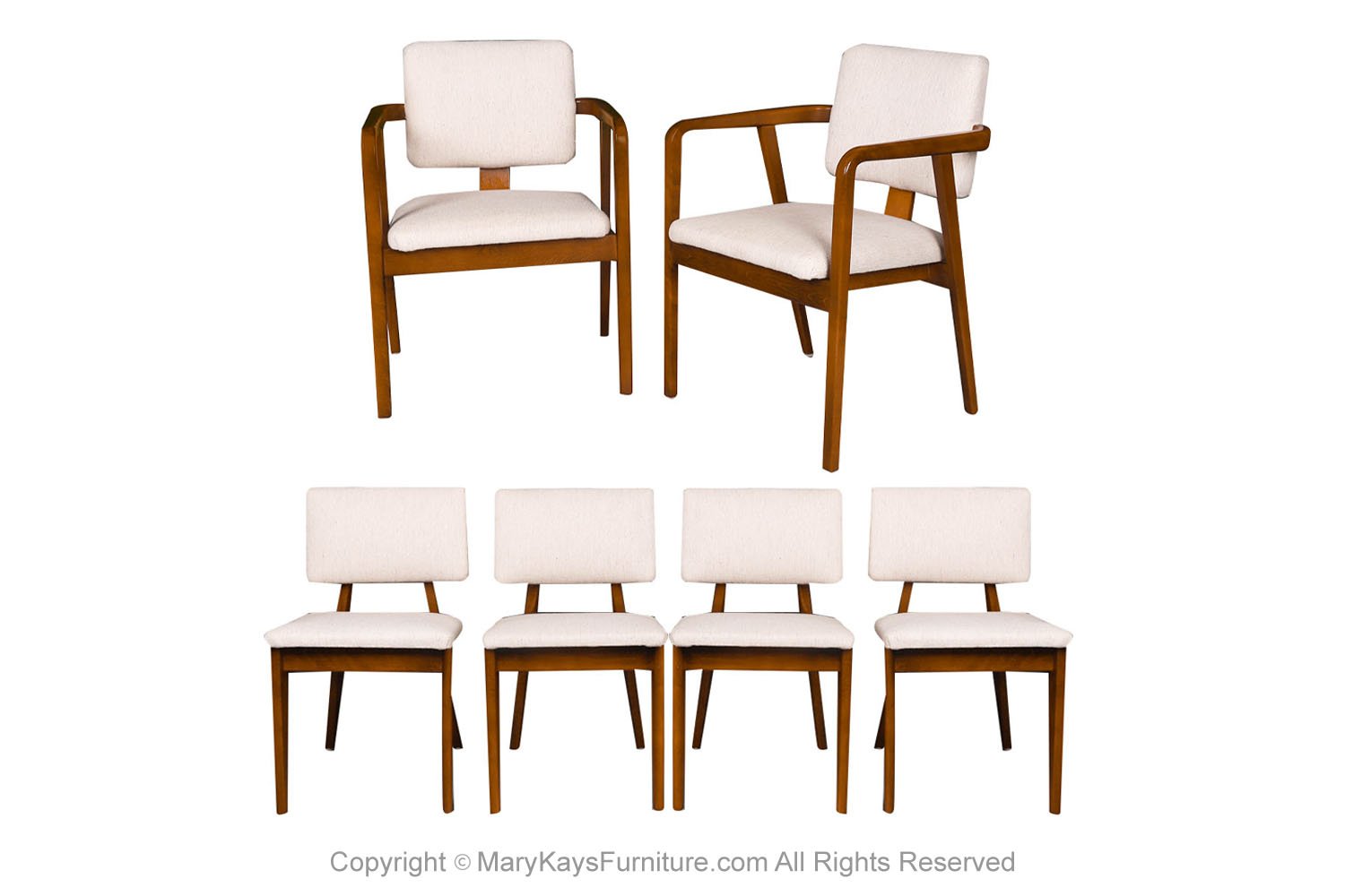 Remarkably, Iconic, stunning and extraordinarily rare set of six Model 4663 dining/side chairs, two armchairs and four side chairs by Earnest Farmer with George Nelson & Associates for Herman Miller, circa 1960. This classic and unique Mid-Century Modern set features a full matching set of six, two which are arm chairs, each remaining in original condition throughout. Features durable frames with sculpture backrests, and padded high density seats, with tapered splayed legs. The arm chairs are beautifully proportioned and feature softly curved and carved arms that float gracefully down the side of the seat and terminate at the splayed legs. They remain in good vintage condition and are comfortable. The rich solid frames are very sturdy and have exceptional stunning wood grain throughout. The sculpted and formed details are what makes them so desired, very modern and elegant. The set would look amazing around a dining room table, or as side chairs. Also, available is a matching Dining table (sold separately). nCondition Report: Original finish wear consistent with age and use, overall gorgeous condition. Construction is strong and sturdy. The upholstery is in great condition, no tears or rips in fabric. n nDesigners: George Nelson & Earnest Farmer nManufacturer: Herman Miller nOf the Period: Mid-Century Modern nPlace of Origin: USA nDate of Manufacture: 1960s nPeriod: 1950-1959 nMaterials and Techniques: Wood, Upholstery nCondition: Good nWear: Wear consistent with age and use nMeasurements: H 30 1/4″ tall x 21″ deep in. x 17″ wide seat 18″ tall Arm chair 31.5″ tall x 23 3/8″ Deep x 23″ wide arm height 25 1/2″ tall seat 17″ tall n n
