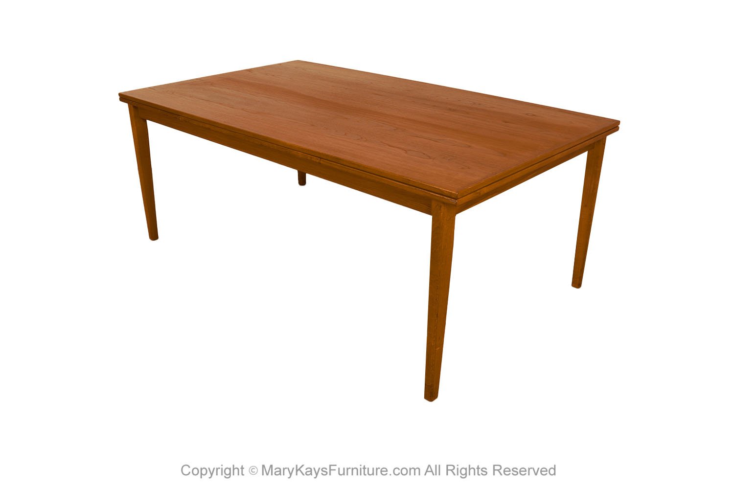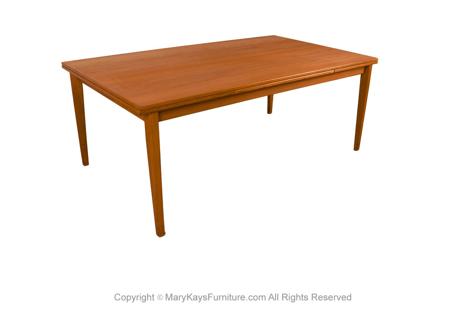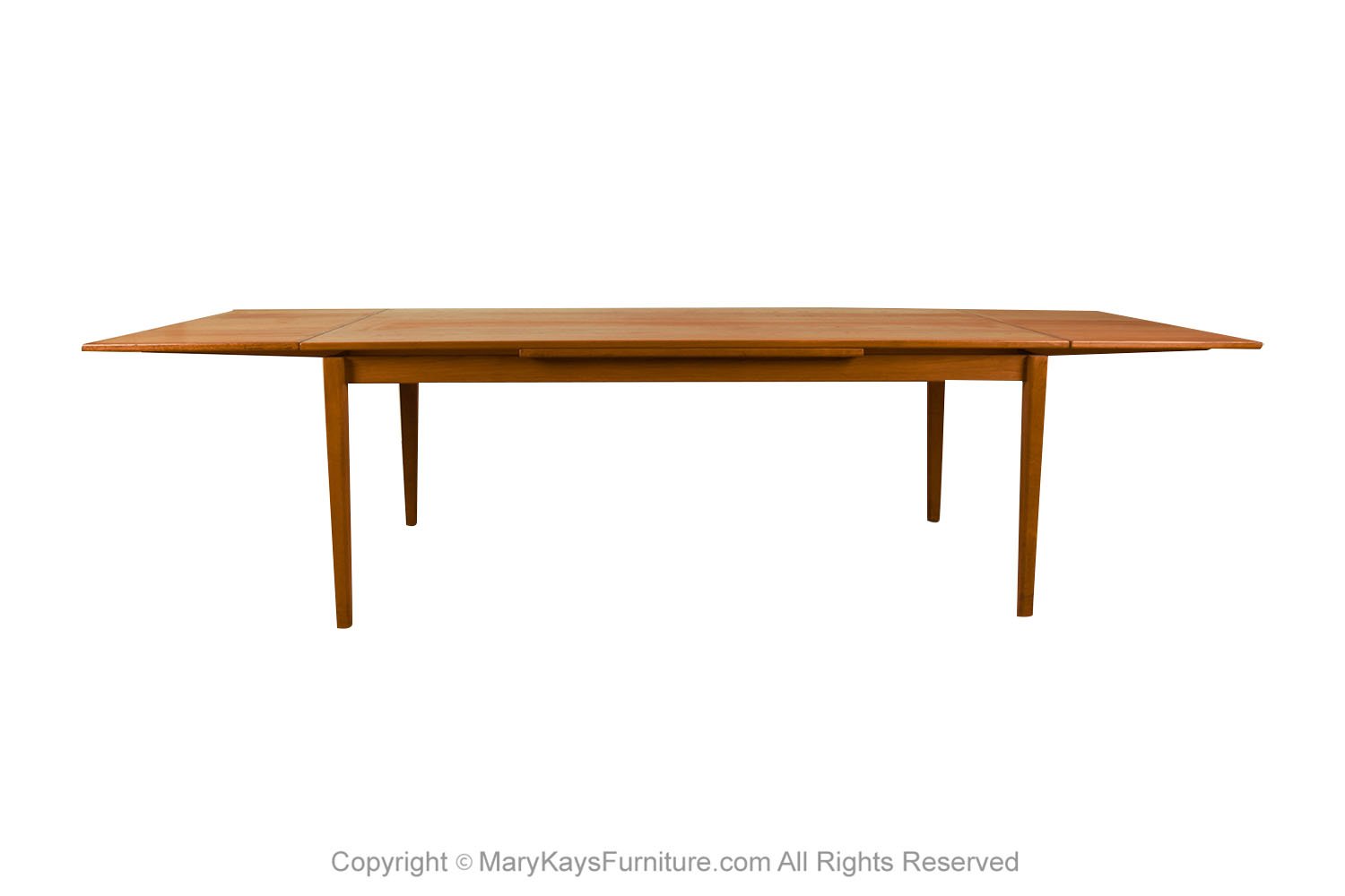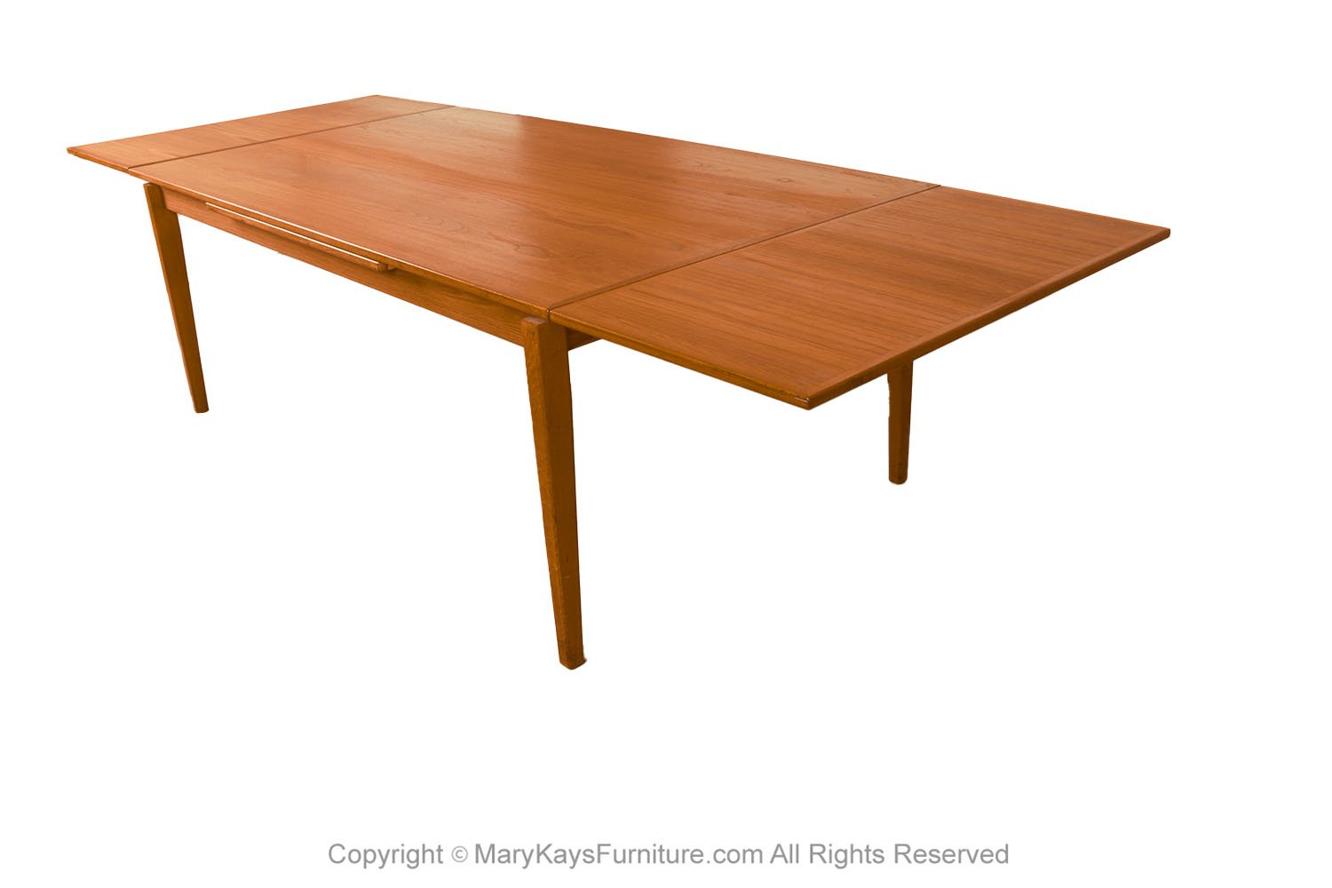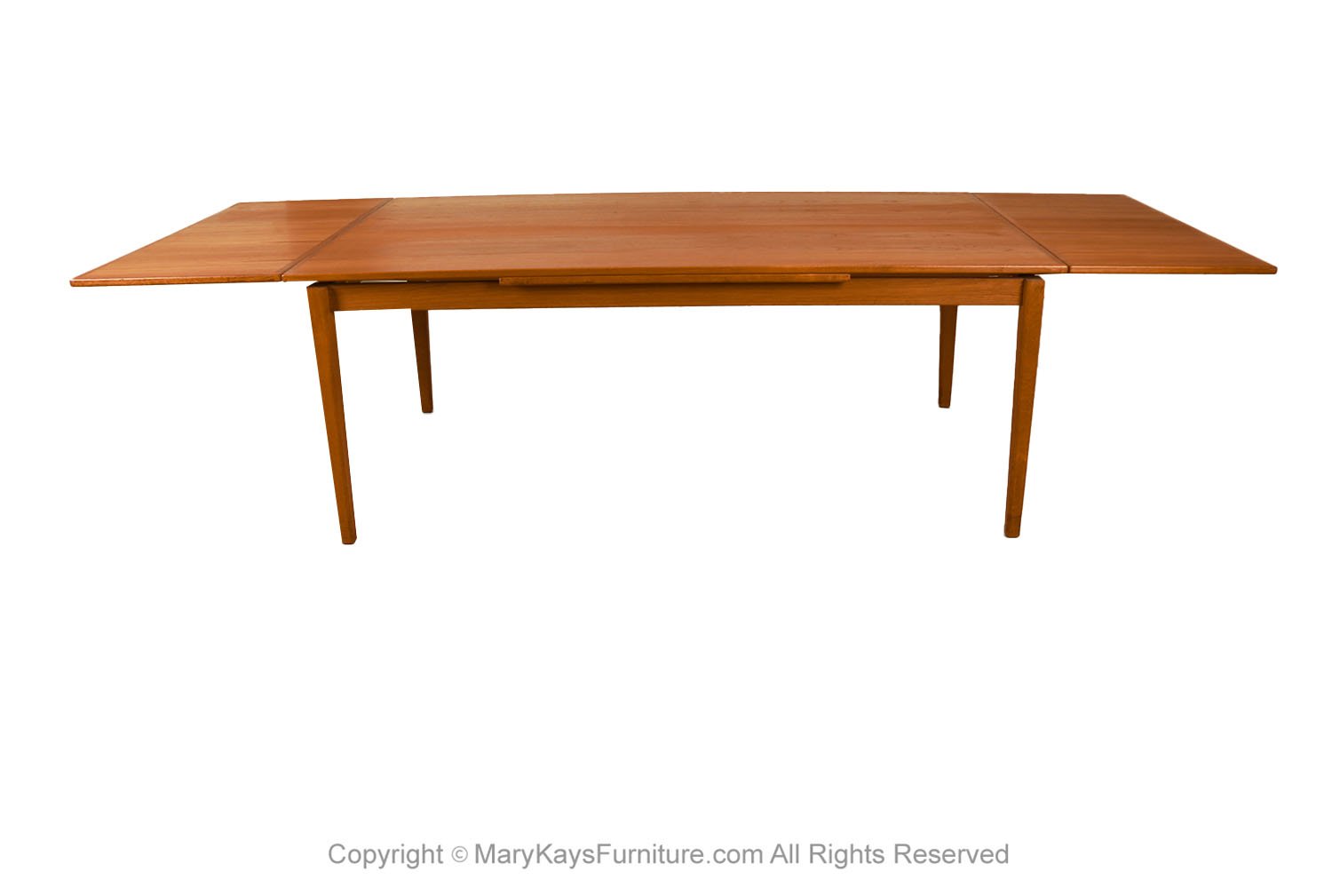 An exceptional, Danish, Modern, teak draw leaf Expandable dining table, by Willy Sigh for H. Sigh and Sons Mobelfabrik, Denmark 1960s. With an initial large footprint, this table can also offer a generous space and double in size once its hidden draw leaves are extended. Amazing design and construction detail, with two built-in self-storing leaves. Simply pull out a leaf on one or both ends to extend the table and create a table that will easily seat 10. This table expands to 114 1/4_ (9.52 feet) long! Wonderfully rich Teak color and grain texture throughout. The rectangular table teak surface with stylish teak grain on the top surface, raised on strong sturdy legs, extends to a large size with two built in leaves. Fully extended it becomes a large conference table, exquisitely constructed, characteristically sleek and functional and exudes an aesthetic beauty as well making it perfect for the modern interior. This is a wonderful table that offers two large leaves, changing it from a medium size table to a large table. Each of the leaves is 20 3/8” across, making this a versatile piece indeed, built to last the test of time. Very good original condition firm and solid build. Sleek two-tone design and sturdy construction add to the attractiveness’ beautifully aged teak with rich patina, quality craftsmanship and exquisite design. nCondition Report: Great original condition, minor surface wear, one circular mark on the right corner, shown in photo. Table is very sturdy and strong. n nManufacturer: H. Sigh and Sons Mobelfabrik nOf the Period: Mid-Century nPlace of Origin: Denmark nDate of Manufacture: 1960s nPeriod: 1960-1969 nMaterials and Techniques: Teak nCondition: good condition. nWear: Wear consistent with age and use nMeasurements: 28 3/8_ tall x 42 1/3_ deep x 73 1/3 _ L (closed) n 114 1/4_ (9.52 feet) fully extended each leaf is 20 3/8” long (24 1/8″ from floor to bottom of the apron) n n
