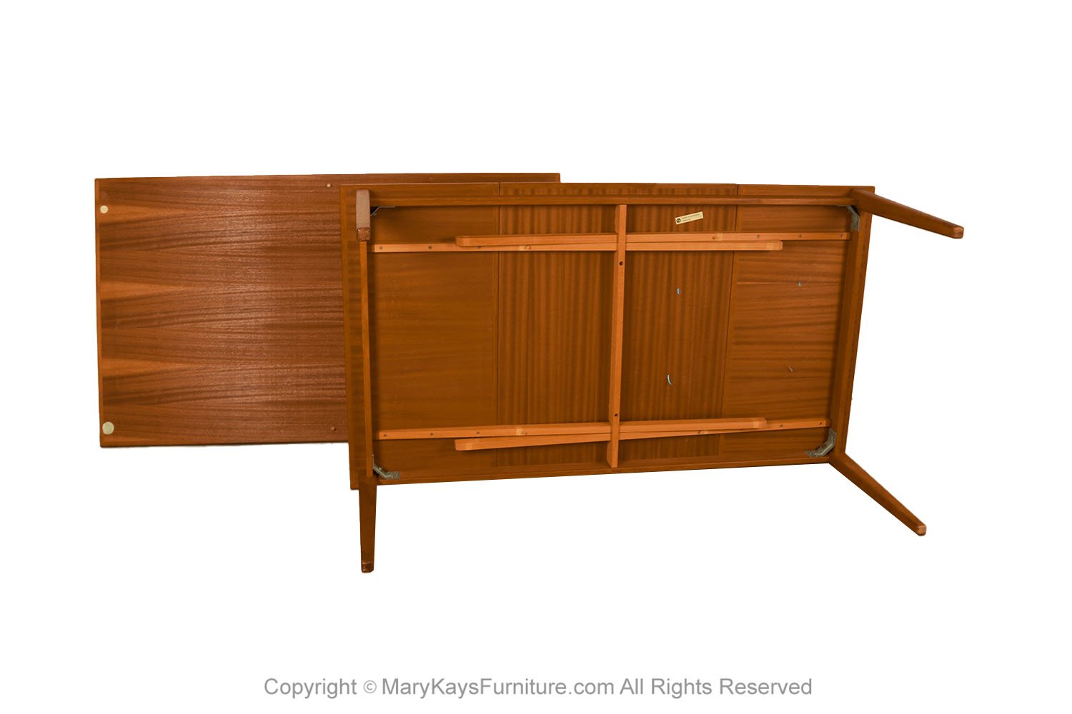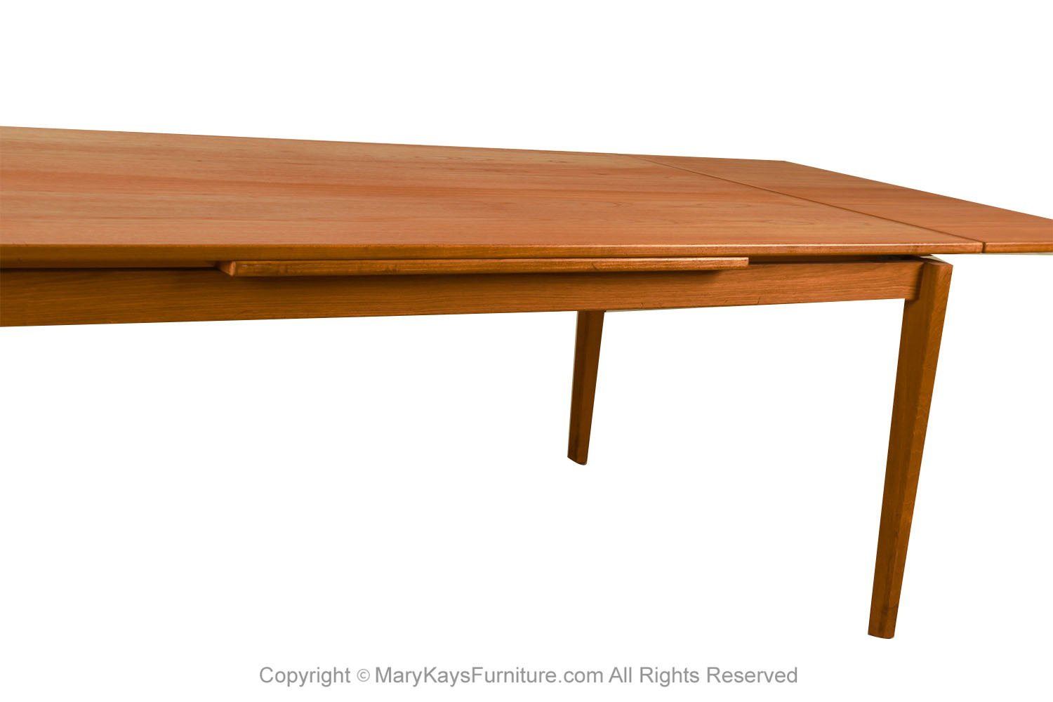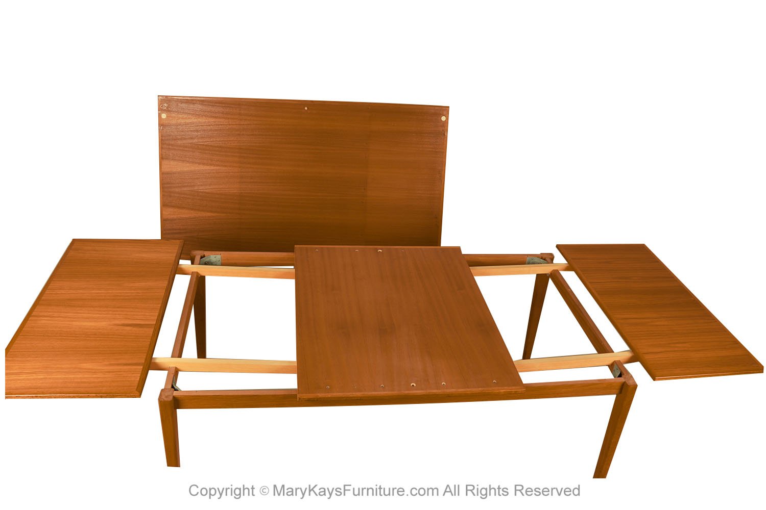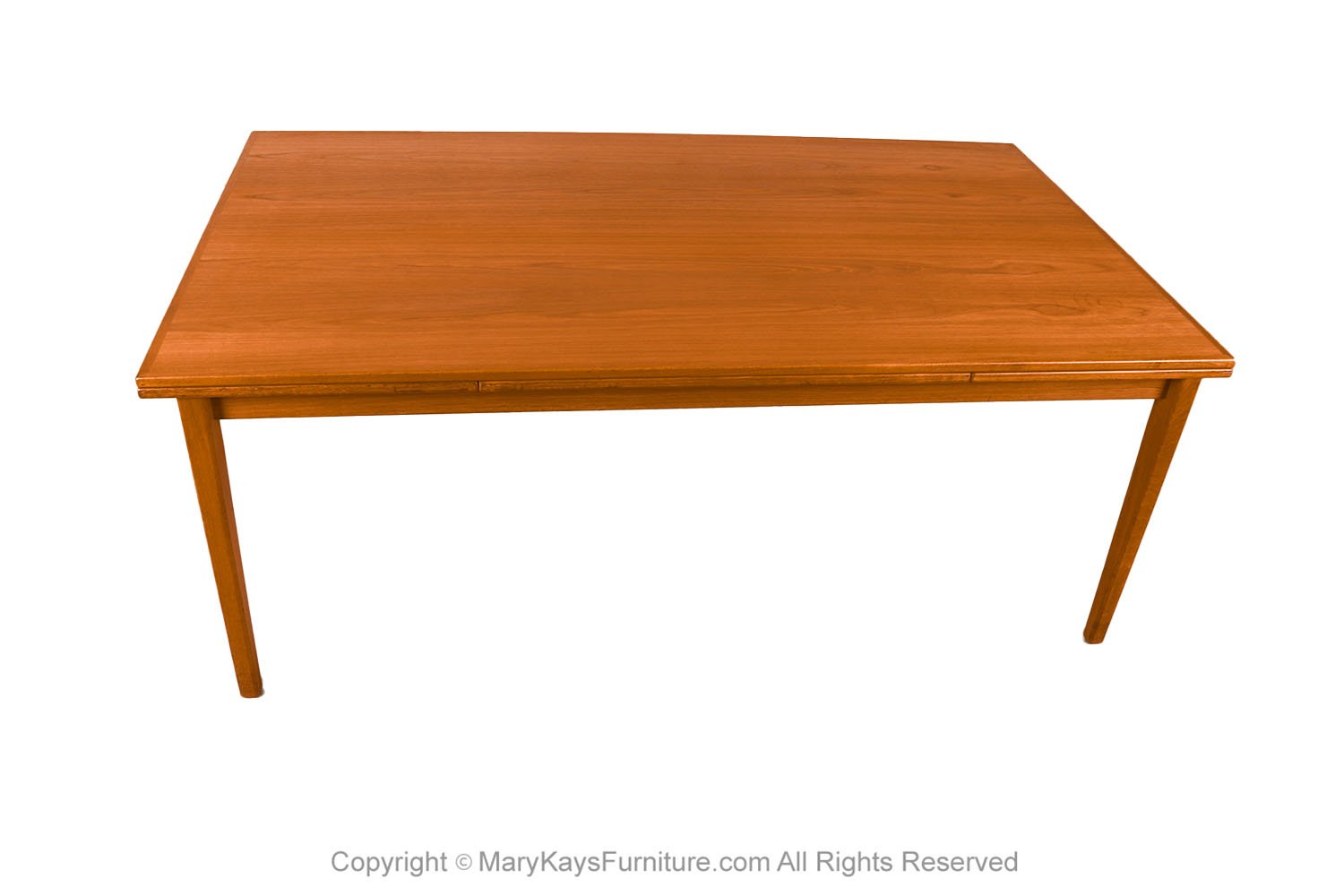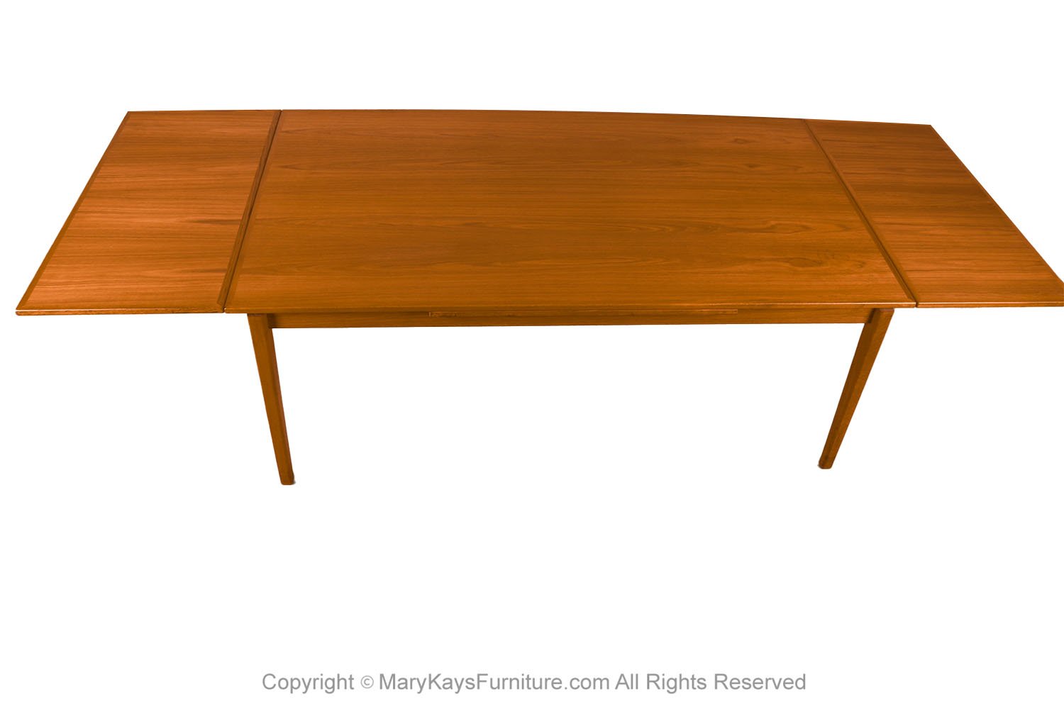An exceptional, Danish, Modern, teak draw leaf Expandable dining table, by Willy Sigh for H. Sigh and Sons Mobelfabrik, Denmark 1960s. With an initial large footprint, this table can also offer a generous space and double in size once its hidden draw leaves are extended. Amazing design and construction detail, with two built-in self-storing leaves. Simply pull out a leaf on one or both ends to extend the table and create a table that will easily seat 10. This table expands to 114 1/4_ (9.52 feet) long! Wonderfully rich Teak color and grain texture throughout. The rectangular table teak surface with stylish teak grain on the top surface, raised on strong sturdy legs, extends to a large size with two built in leaves. Fully extended it becomes a large conference table, exquisitely constructed, characteristically sleek and functional and exudes an aesthetic beauty as well making it perfect for the modern interior. This is a wonderful table that offers two large leaves, changing it from a medium size table to a large table. Each of the leaves is 20 3/8” across, making this a versatile piece indeed, built to last the test of time. Very good original condition firm and solid build. Sleek two-tone design and sturdy construction add to the attractiveness’ beautifully aged teak with rich patina, quality craftsmanship and exquisite design. nCondition Report: Great original condition, minor surface wear, one circular mark on the right corner, shown in photo. Table is very sturdy and strong. n nManufacturer: H. Sigh and Sons Mobelfabrik nOf the Period: Mid-Century nPlace of Origin: Denmark nDate of Manufacture: 1960s nPeriod: 1960-1969 nMaterials and Techniques: Teak nCondition: good condition. nWear: Wear consistent with age and use nMeasurements: 28 3/8_ tall x 42 1/3_ deep x 73 1/3 _ L (closed) n 114 1/4_ (9.52 feet) fully extended each leaf is 20 3/8” long (24 1/8″ from floor to bottom of the apron) n n