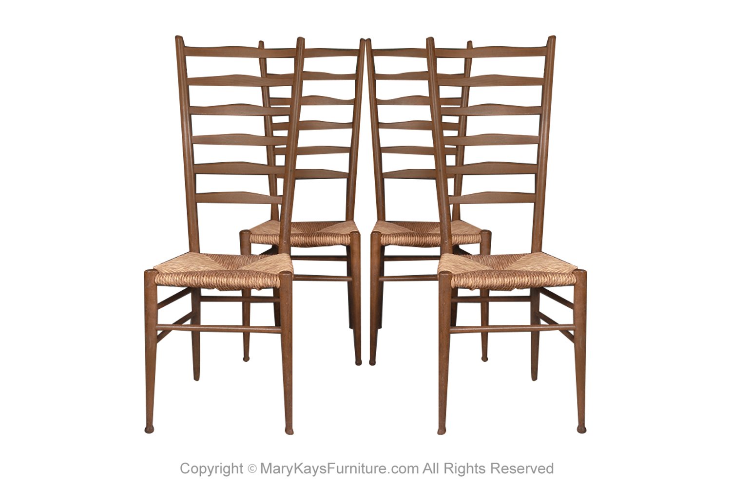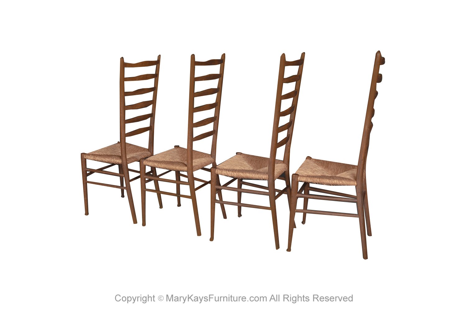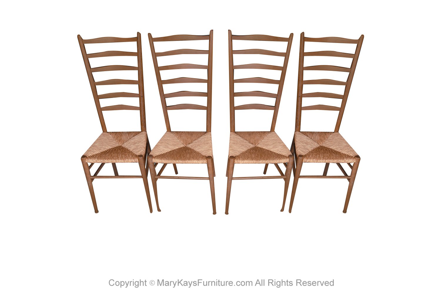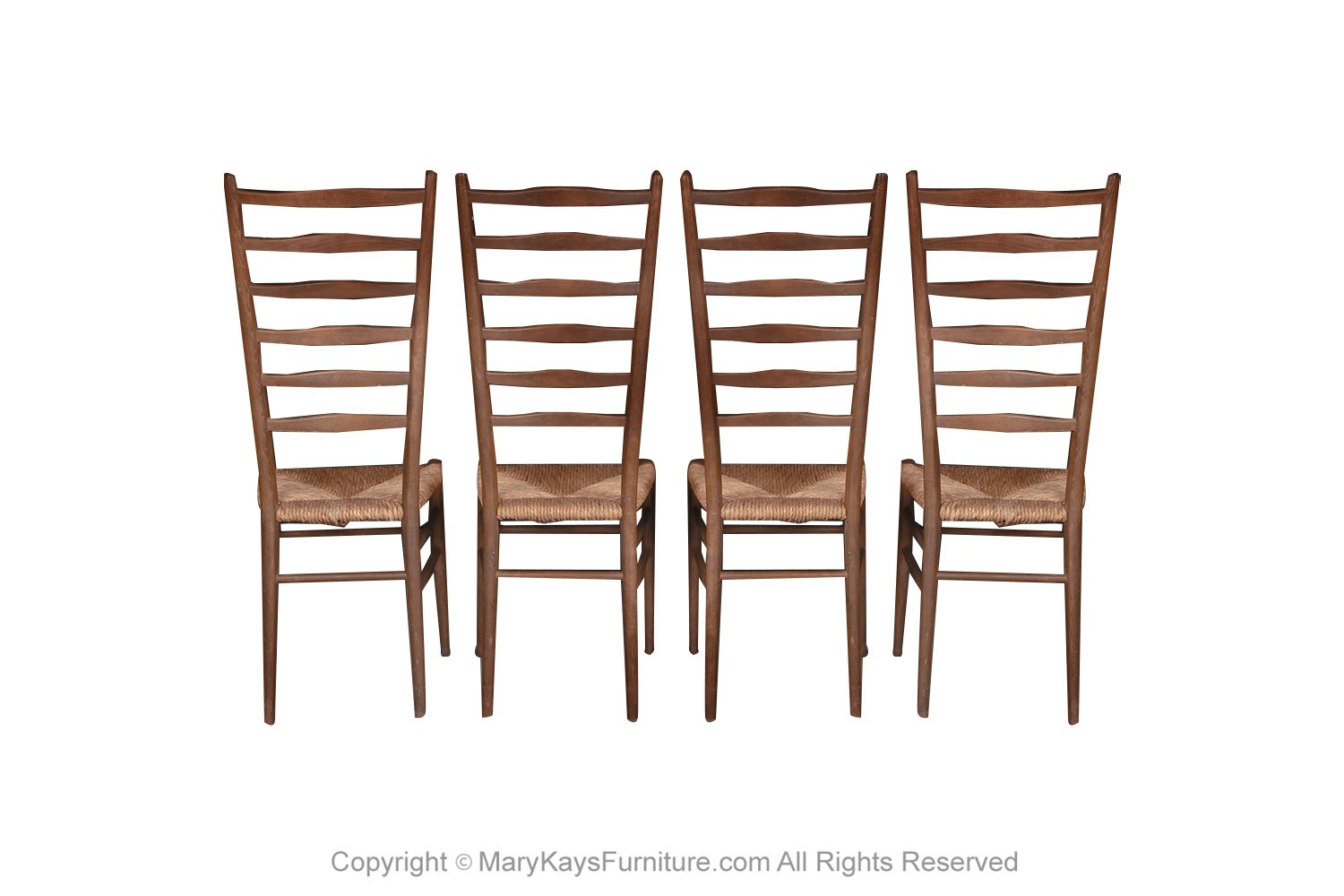 Exceptional set of four tall ladder back dining side chairs in the style of Gio Ponti, Italy, c. 1950s. Each chair features a high back, with six horizontal slats, woven natural paper cord rush seats, and a handsome leg design with splayed back legs and ball foot front legs, supported by six stretchers giving a simple Tuscan countryside style and warm traditional appeal. These sturdy, comfortable and lightweight chairs will blend nicely with a mid-century modern or rustic decor. nCondition Report: Original wood finish, minor age appropriate wear construction is stable and sturdy; rich wood color and patina, seats tight and supportive. n nIn The Style of: Gio Ponti nManufacturer: Unknown nPlace/Country of Origin: Italy nOf the Period: Mid-Century Modern nPeriod: 1960s nMaterials and Techniques: Wood, Rush nCondition: Very Good nWear: Wear consistent with age and use nMeasurements: 16” Wide x 18” Deep x 44” High, Seats 18″ High n n