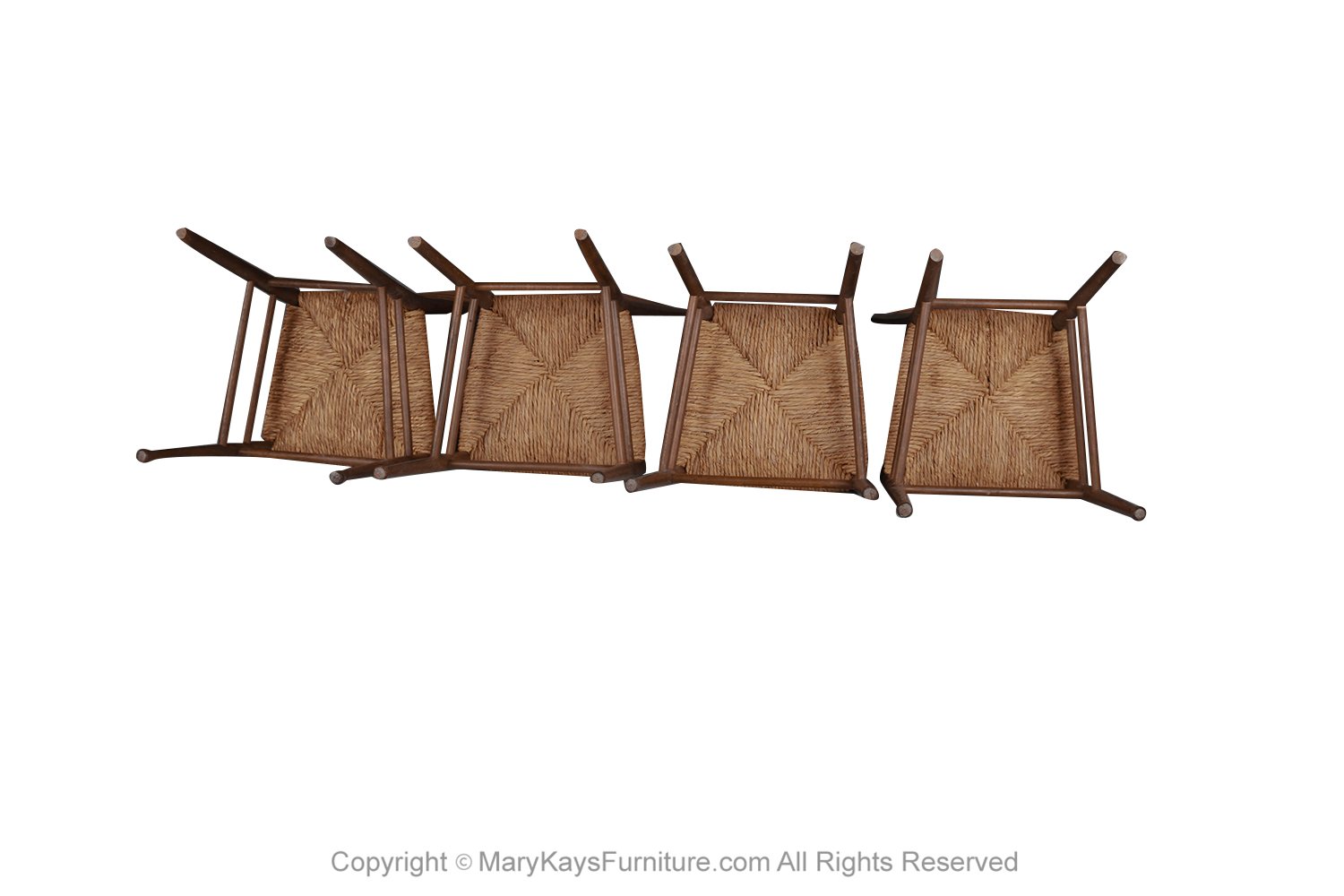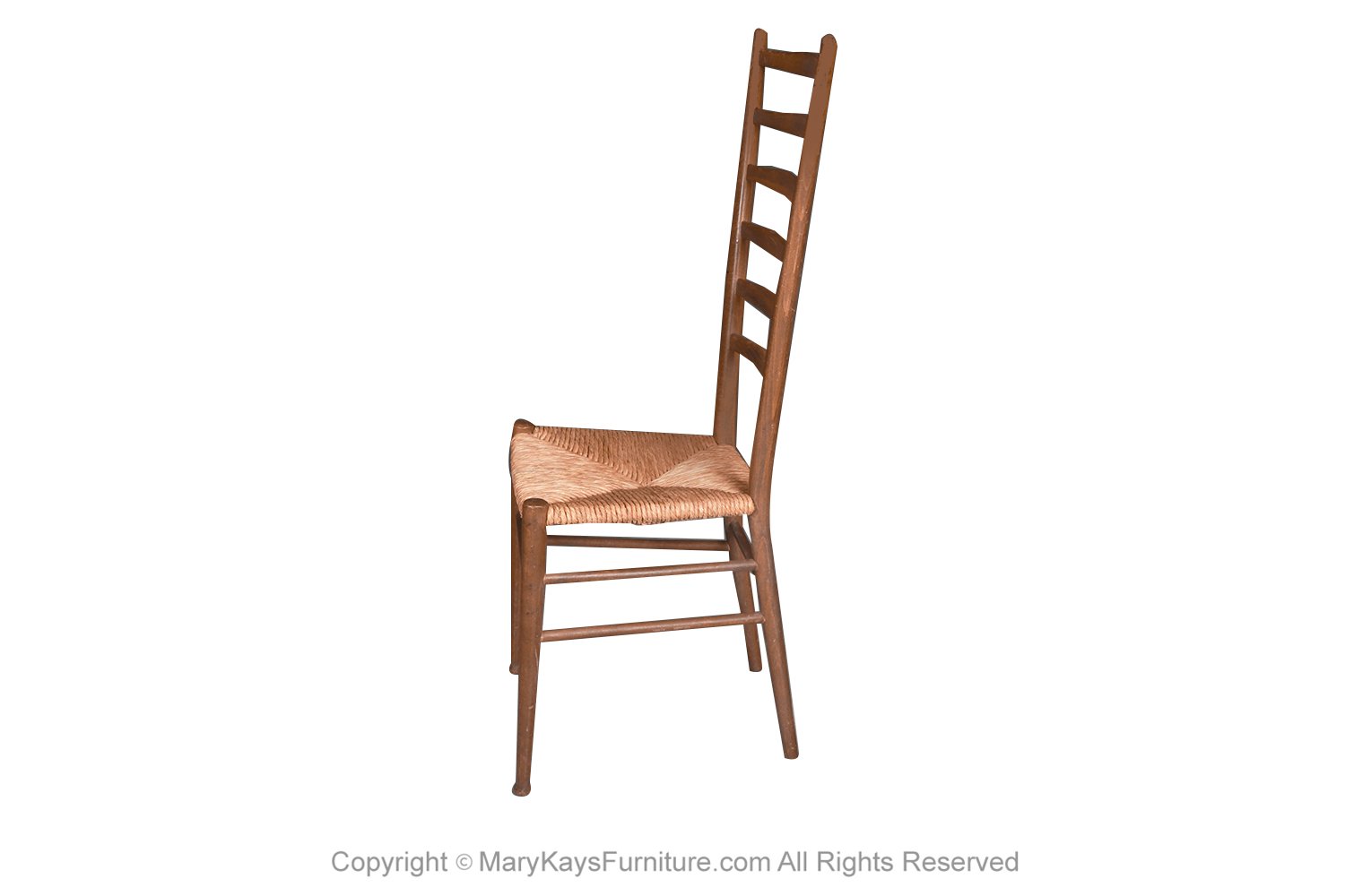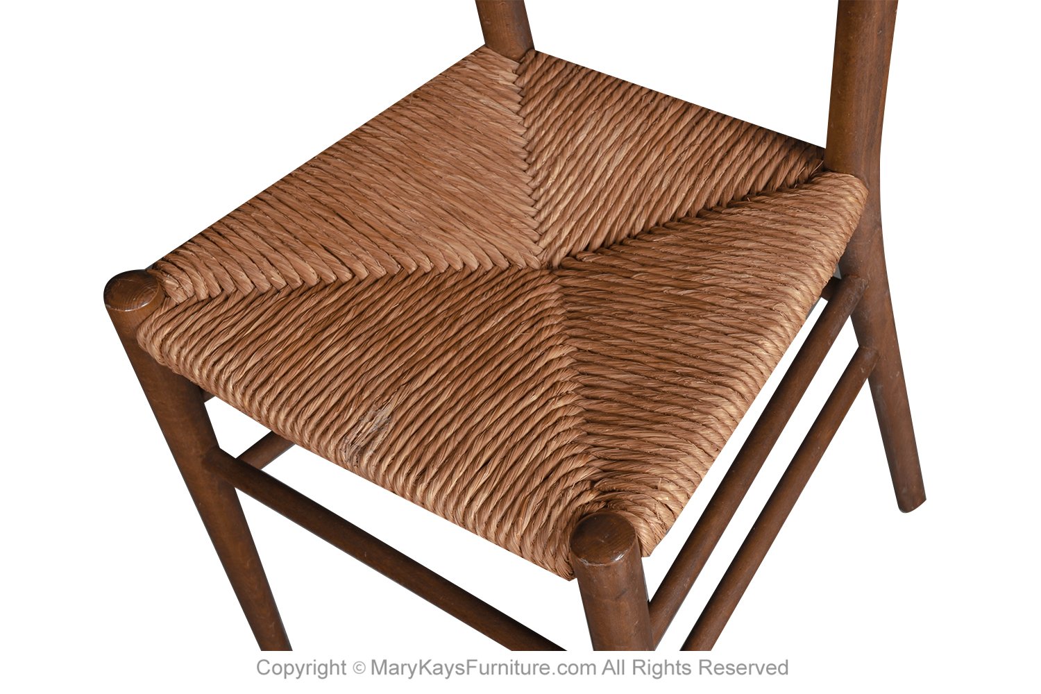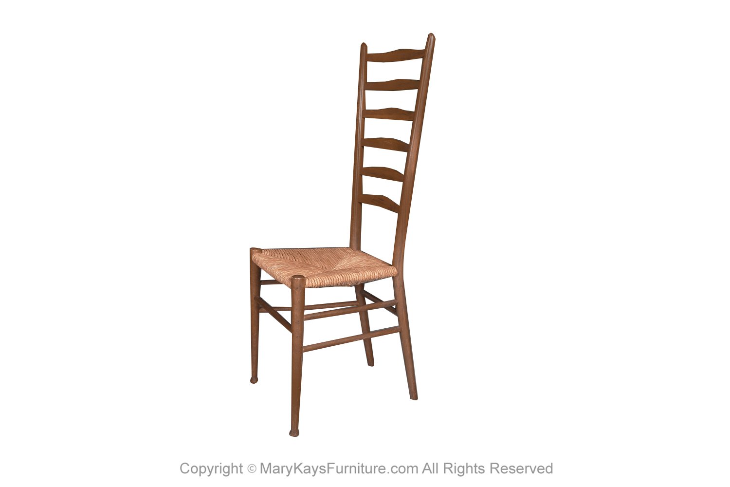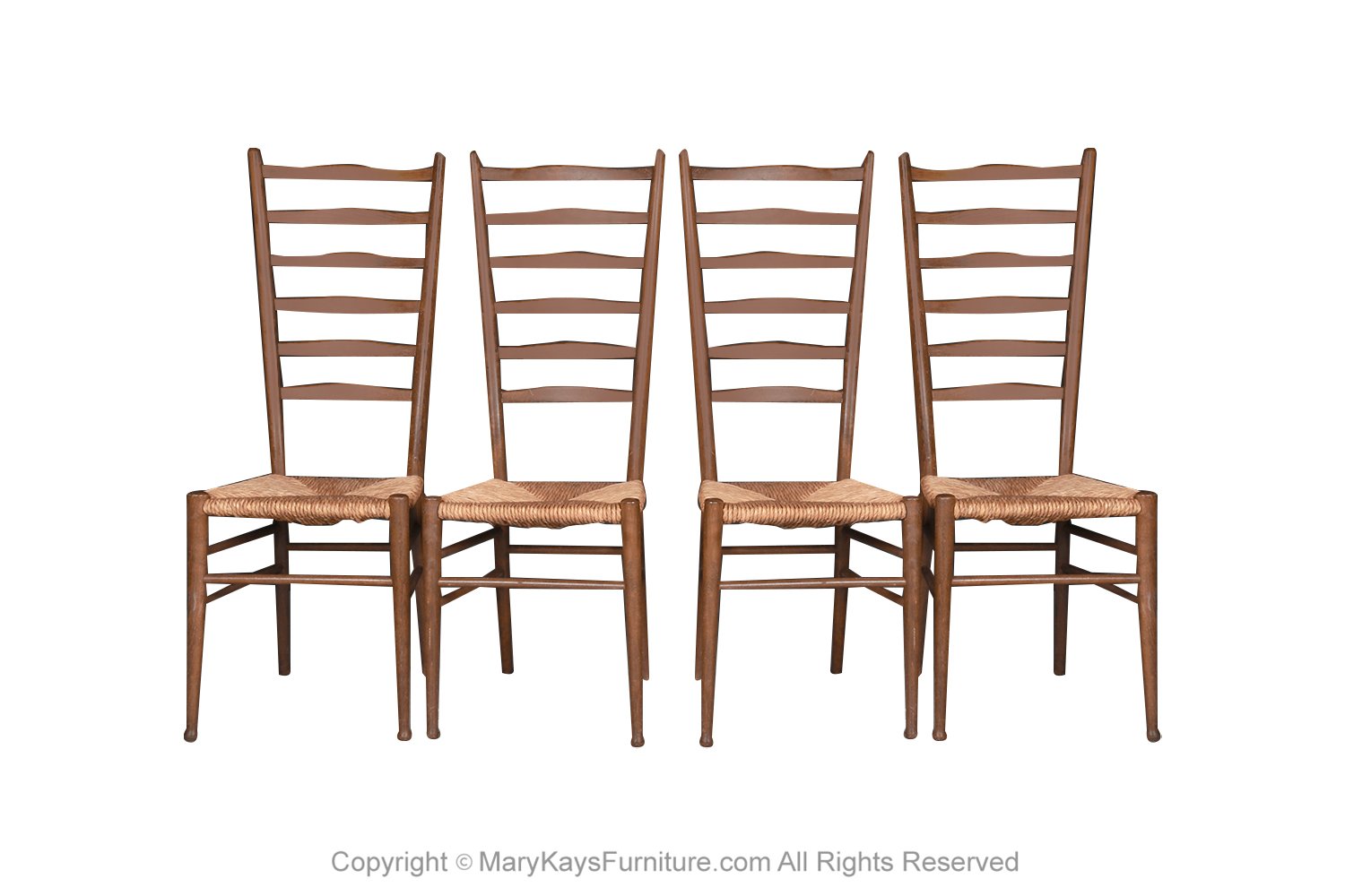 Exceptional set of four tall ladder back dining side chairs in the style of Gio Ponti, Italy, c. 1950s. Each chair features a high back, with six horizontal slats, woven natural paper cord rush seats, and a handsome leg design with splayed back legs and ball foot front legs, supported by six stretchers giving a simple Tuscan countryside style and warm traditional appeal. These sturdy, comfortable and lightweight chairs will blend nicely with a mid-century modern or rustic decor. nCondition Report: Original wood finish, minor age appropriate wear construction is stable and sturdy; rich wood color and patina, seats tight and supportive. n nIn The Style of: Gio Ponti nManufacturer: Unknown nPlace/Country of Origin: Italy nOf the Period: Mid-Century Modern nPeriod: 1960s nMaterials and Techniques: Wood, Rush nCondition: Very Good nWear: Wear consistent with age and use nMeasurements: 16” Wide x 18” Deep x 44” High, Seats 18″ High n n