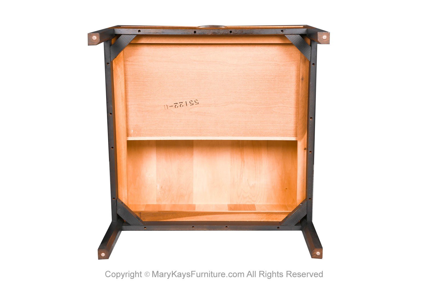 An exceptional Campaign style mid-century modern, large side/ end table in the style of Jack Cartwright for Founders, circa 19th century. This absolute jewel remains in nearly pristine condition. The lines are clean and elegant. Features rich warm beautifully grained walnut frame, with chamfered edge, square top, framing above two large dovetail drawers. The original classic campaign style concave brass pulls accented with black backplates are in good shape. The table is raised above an ebonized black wood base and legs. An exceedingly fine table, has been very well taken care of over the years. This attractive and unique table will add a touch of pizzazz to a bedroom, or beautifully border a sofa in a living/family room. Classic modernist quality and design piece for any style interior! nCondition Report: Original finish, exhibit little signs of wear, overall good surface condition. Construction is strong and sturdy. n n nManufacturer: in the style of Jack Cartwright for Founders nPlace of Origin: United States nPeriod: 19th century nDesign Period: Hollywood Regency Campaign nMaterials: Walnut, Brass nCondition: Good nWear: Wear consistent with age and use nMeasurements: 30” W x 30” D x 21 1/2” H n n